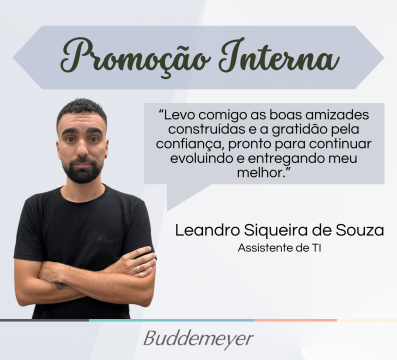 Recursos Humanos fev 04 • 09:03 Promoção Interna – Leandro Siqueira de Souza Na Buddemeyer, cada passo é conquista. Confira a trajetória do colaborador Leandro!