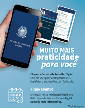 Recursos Humanos maio 26 • 11:34 Carteira de Trabalho Digital: Novos tempos exigem novas experiências! Produtividade, segurança e praticidade são os benefícios da digitalização de documentos. Novos tempos exigem novas experiências e pensando nisso o RH da Bud está realizando uma ação de cadastramento da Carteira de Trabalho digital para você colaborador que ainda não conta com esta comodidade. Ficou curioso? Então clique aqui.