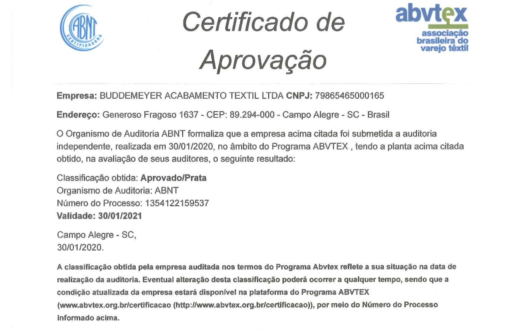 Certificado de Aprovação abvtex – Acabamento Textil – Validade em 30/01/2021