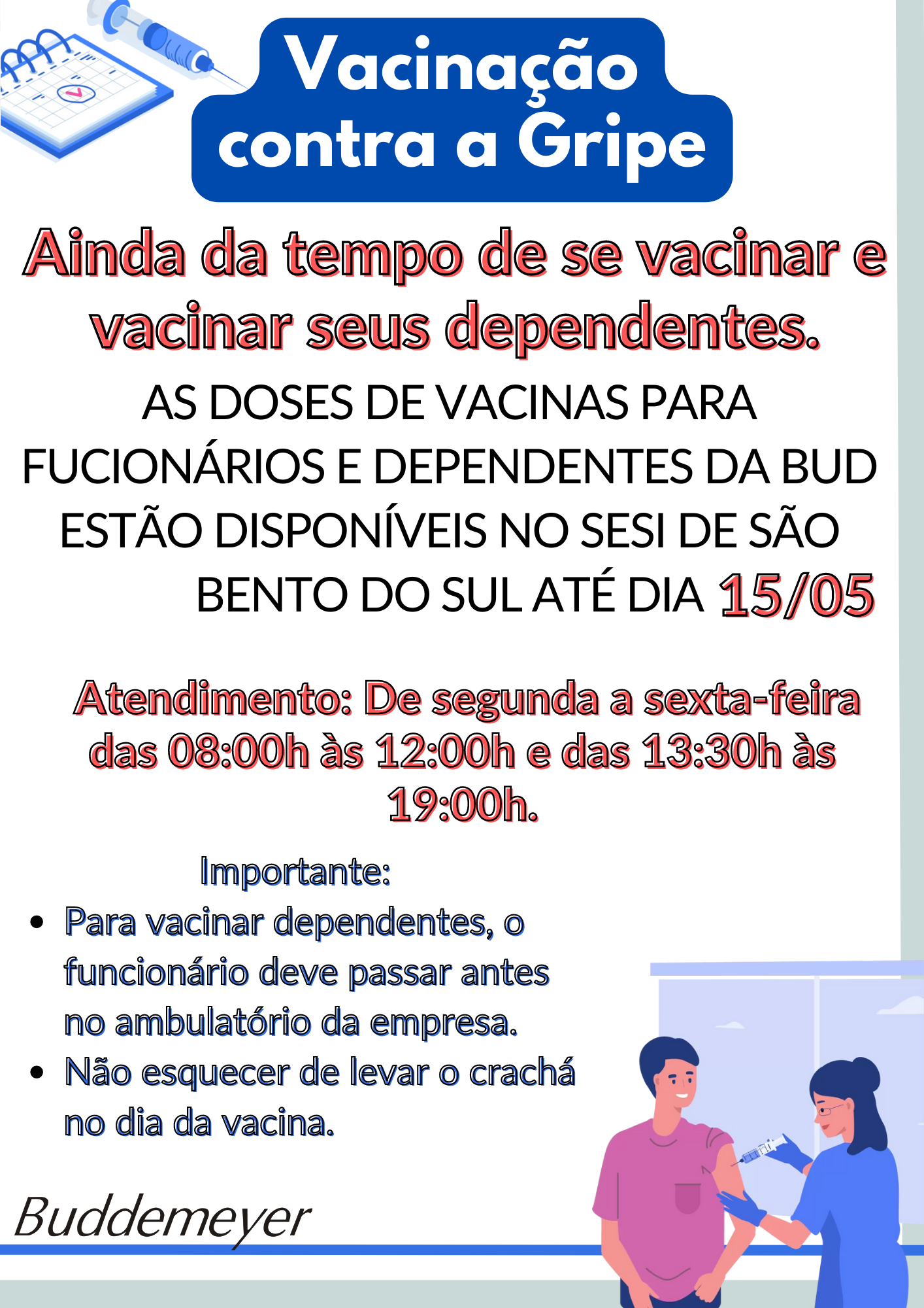 Recursos Humanos • maio 04 • 11:31 CAMPANHA DE VACINAÇÃO CONTRA A GRIPE Ainda da tempo de se proteger, clique no link e confira onde pode tomar sua dose de vacina contra a gripe. LEMBRE-SE a dose é GRATUITA PARA FUNCIONÁRIOS BUD.