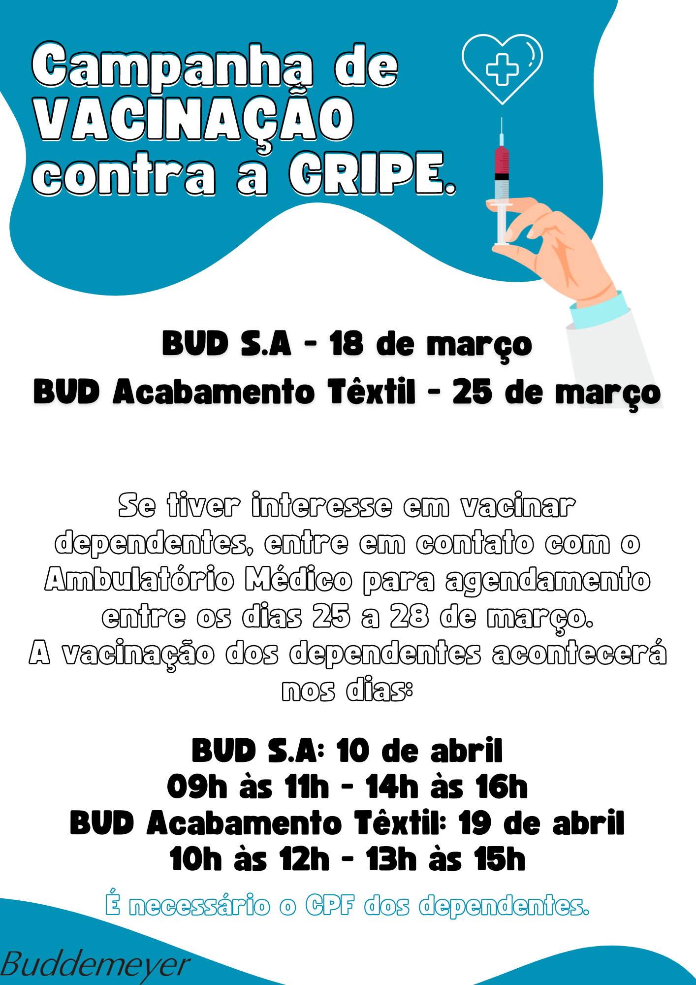Recursos Humanos • mar 14 • 17:17 Campanha de VACINAÇÃO contra a GRIPE. Estamos muito próximos a mais uma campanha de vacinação contra a gripe. Clique e confira o prazo para garantir a vacina a seus dependentes.