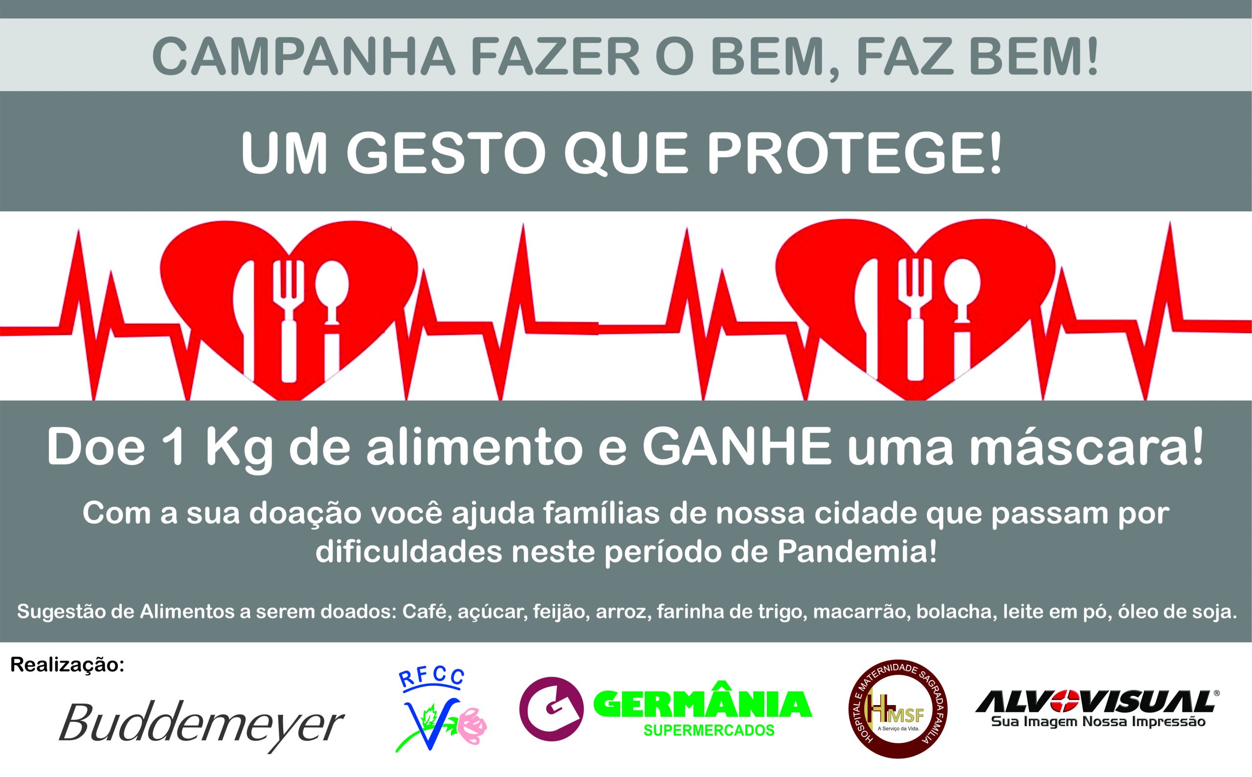 Esta ação acontecerá no Hiper Germânia e funcionará da seguinte maneira: Ao doar 1 Kg de alimento, você ganha uma máscara para uso durante o período da pandemia. A Bud contará com a participação de nossos bombeiros voluntários na operação da campanha, que inicialmente será neste sábado, domingo e segunda-feira.