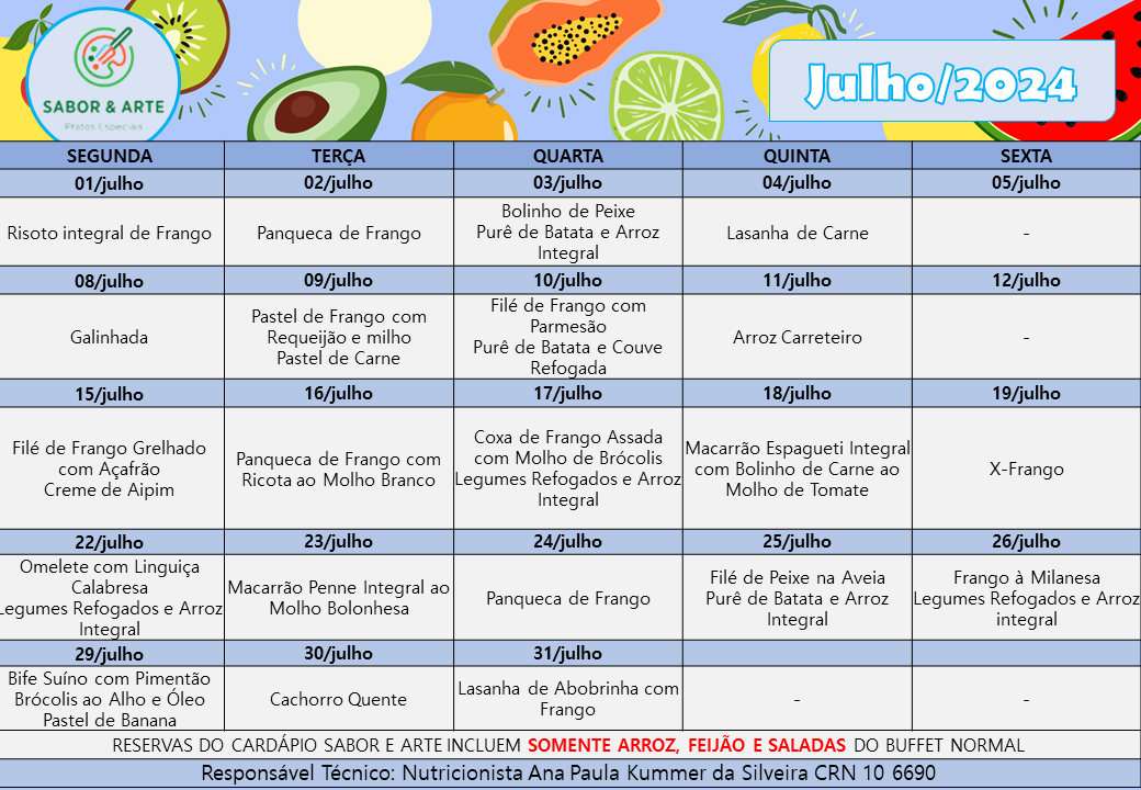 Cardápio Sabor e Arte | Julho