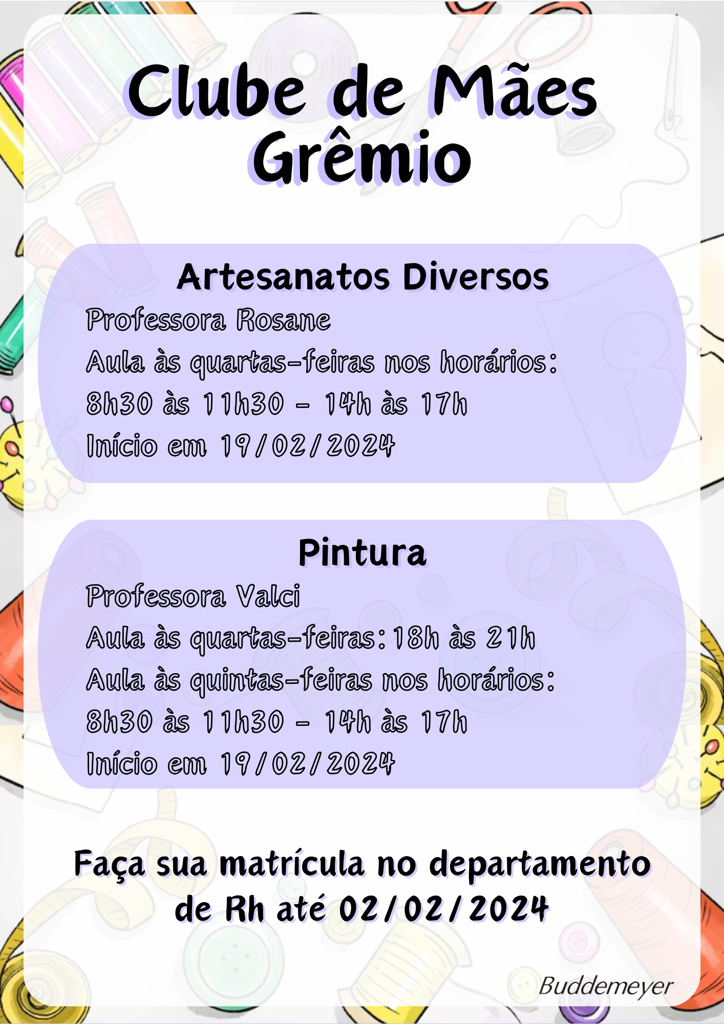 O Clube de Mães irá retornar às atividades! As inscrições devem ser realizadas até o dia 02 de fevereiro no setor de RH. Clique e confira as datas e horários das aulas.