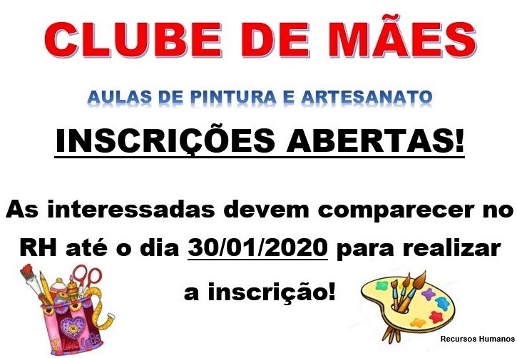 Recursos Humanos • jan 21 • 14:14 Clube de Mães Bud 2020 Colaboradoras, fiquem ligadas! Estão abertas as inscrições para o Clube de Mães 2020! As interessadas devem comparecer no RH até o dia 30 de janeiro para realizar a inscrição.