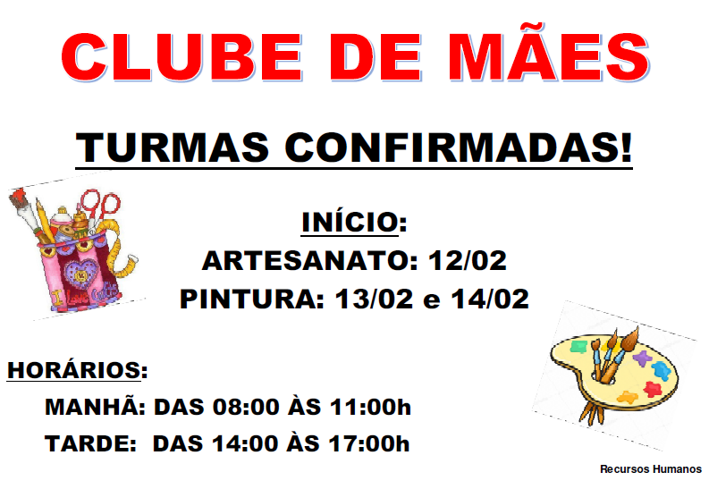 Recursos Humanos • fev 07 • 14:29 Clube de Mães | Turmas confirmadas Colaboradoras, fiquem ligadas! As turmas do Clube de Mães já estão confirmadas. Clique aqui e confira as datas e horários!
