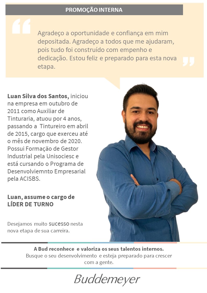 Recursos Humanos • mar 26 • 11:29 Construir uma trajetória de sucesso exige confiança e muito empenho Clique aqui e confira a trajetória do colega Luan na Buddemeyer.