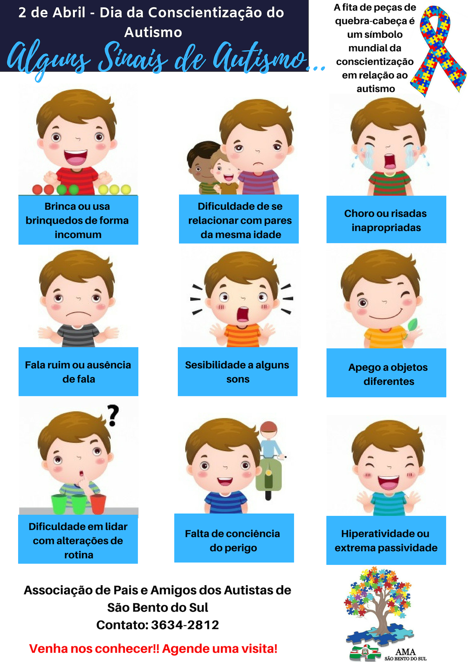 A Bud, juntamente com o Centro Municipal de Atendimento Educacional Especializado para Autismo Professora Maria Celeste Novack e a Associação de Pais e Amigos dos Autistas – AMA São Bento do Sul, convida os pais, familiares e amigos dos Autistas para participarem da Caminhada Azul, que acontecerá no dia 06 de abril, às 10h. O local de saída será em frente ao Centro Administrativo Leopoldo Zschoerper, seguindo pela rua do Shopping Zipperer, frente da Prefeitura, entrada no calçadão e finalização na Praça Getúlio Vargas, com distribuição de pipoca e algodão-doce. VISTA AZUL E PARTICIPE!! Sua presença é muito importante!