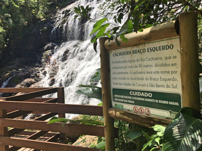 - Parque Ecológico Braço Esquerdo: é situado em uma propriedade particular que faz parte da Área de Proteção Ambiental Rio Vermelho/Humboldt, entre as cidades de São Bento do Sul e Corupá. A sua posição geográfica nos presenteia com atrativos naturais exuberantes, como a Cachoeira Braço Esquerdo, com mais de 90m; a Caverna da Fuga; e a Trilha do Vale Perdido, com inúmeros riachos, quedas d’água e formações rochosas de milhões de anos. O parque é perfeito para aproveitar os dias de verão e curtir com a família e os filhos!