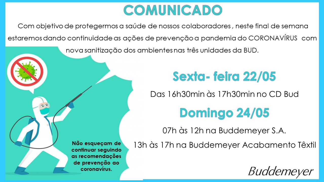 Dando continuidade as ações de prevenção do Coronavírus, a Bud irá sanitizar as três unidades neste final de semana.