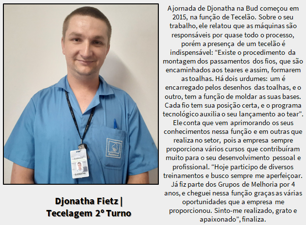 Hoje, 03 de dezembro, comemora-se o dia do tecelão: um dos profissionais mais importantes da indústria têxtil, responsável por fabricar e tecer os tecidos de diversos tipos. O colaborador Djonatha Fietz, da Tecelagem 2º Turno, nos conta um pouco sobre essa função. Clique aqui!
