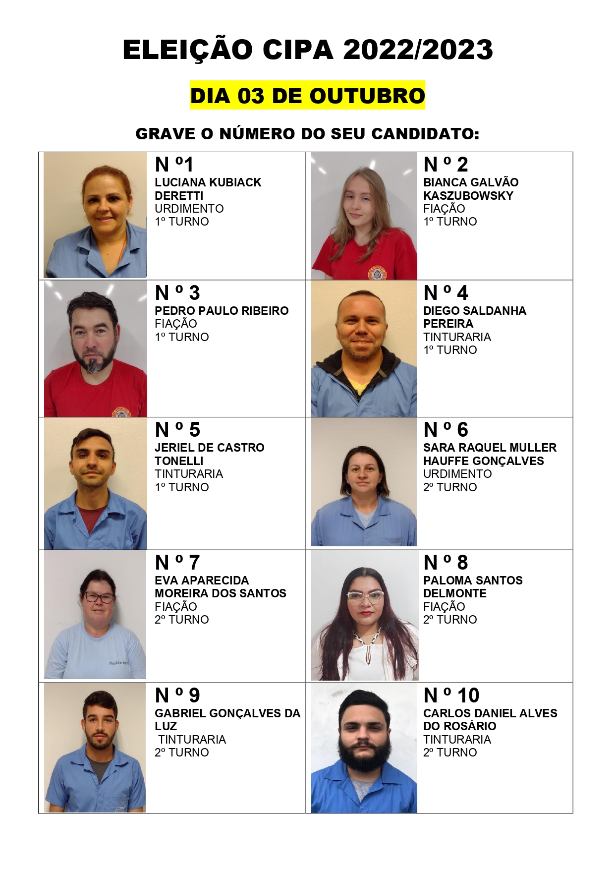 Dia 03 de outubro acontecerá na BUD Acabamento Têxtil a eleição da CIPA 2022. Clique no link e confira o número dos candidatos e o local de votação.