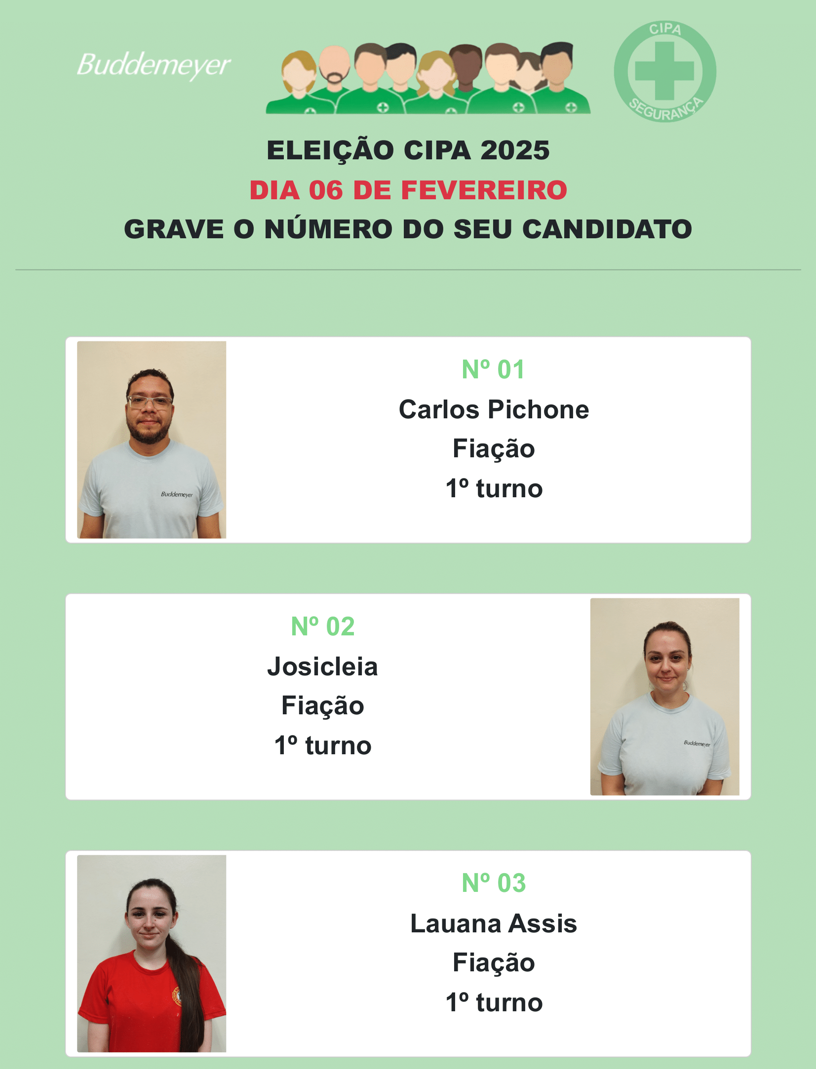 Recursos Humanos • fev 05 • 08:20 ELEIÇÕES CIPA 2025 – BUD S.A Filial Dia 06 de fevereiro acontecerá na BUD Filial S.A a eleição da CIPA 2025. Clique no link e confira o número dos candidatos e o local de votação.