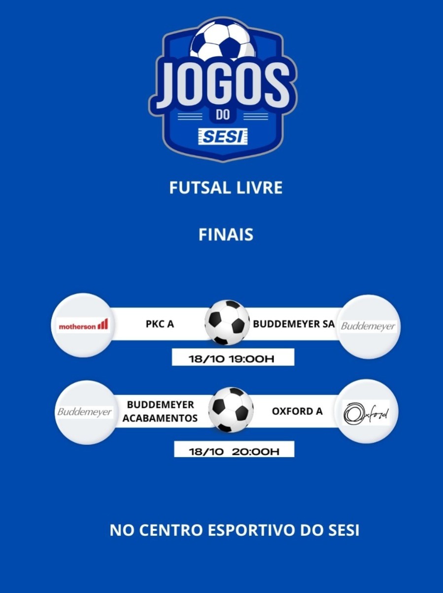 Recursos Humanos • out 17 • 10:57 Está chegando a grande final do SESIANO de Futsal A final do SESIANO acontece amanhã, 18 de outubro, e a Buddemeyer S.A disputará o terceiro lugar e a Buddemeyer Acabamento Têxtil disputará o primeiro lugar. Clique e confira os horários dos jogos.