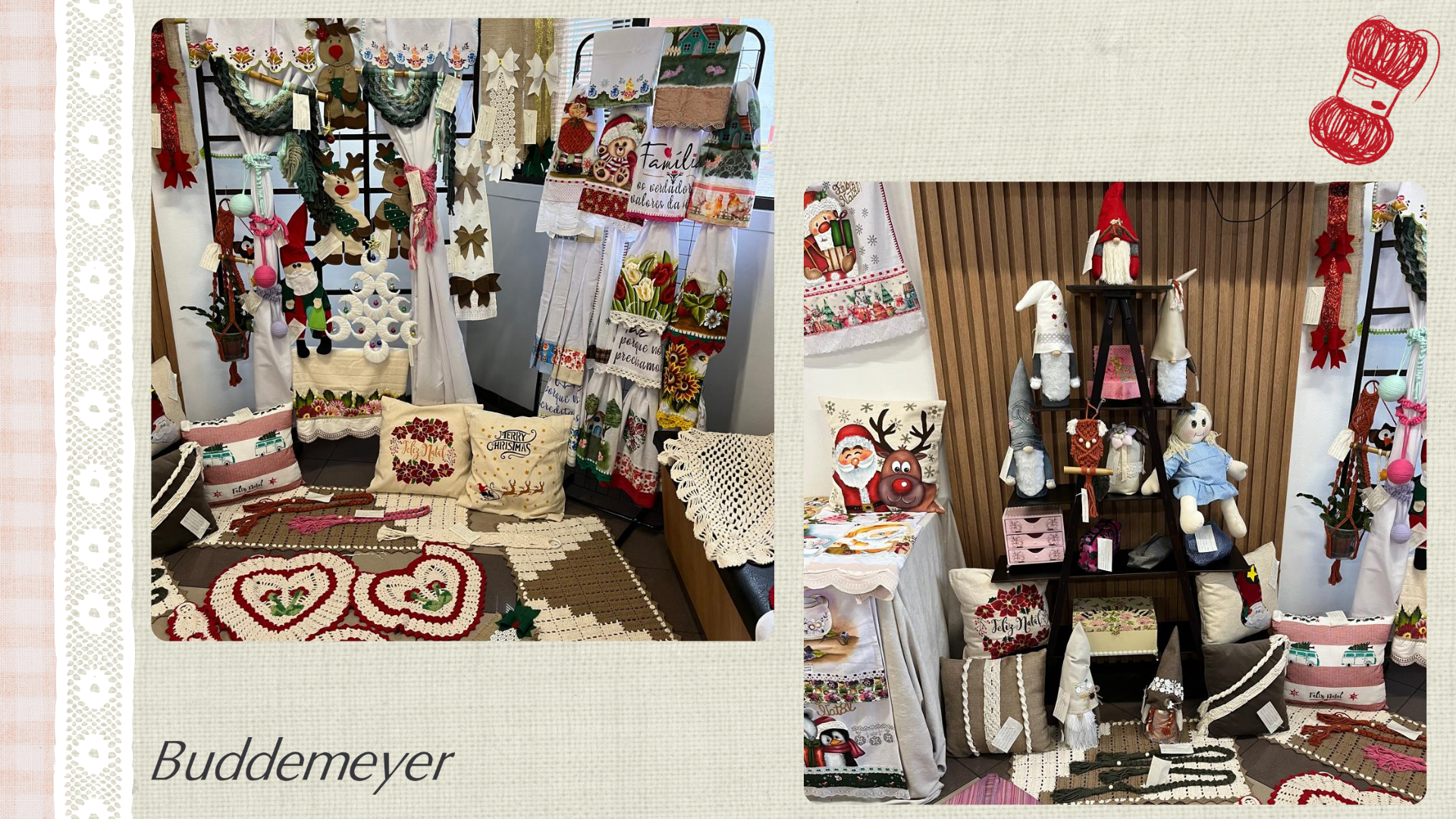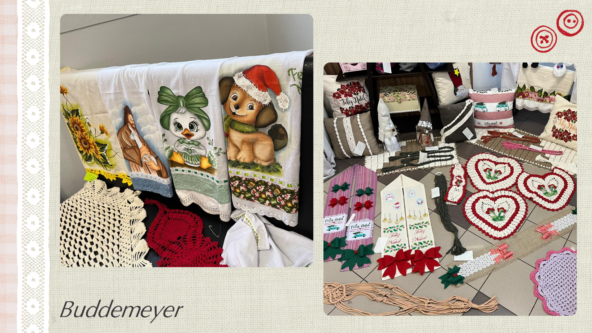 No dia 09/12, no restaurante da Bud SA, foram expostos os trabalhos de artesanato e pintura desenvolvidos ao longo do ano de 2025 pelas participantes do Clube de Mães Buddemeyer, sob a coordenação das professoras Rosane e Valci. 🧶🎨