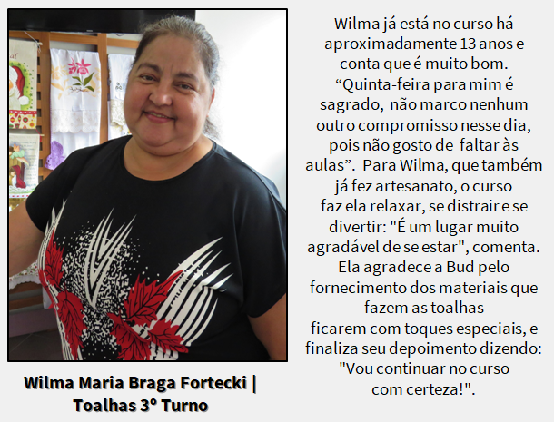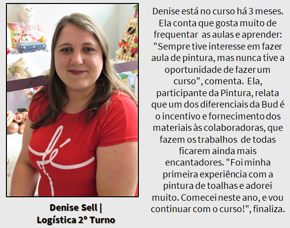 Hoje, 04 de dezembro, iniciou a exposição, no Restaurante da Bud S. A., dos belíssimos trabalhos realizados durante o ano pelo Clube de Mães da Bud. As colaboradoras Denise Sell, da Logística 2º Turno, e Wilma Maria Braga Fortecki, das Toalhas 3º turno, nos contam sobre suas experiências no curso. Confira os seus depoimentos e algumas fotos da linda exposição clicando aqui!