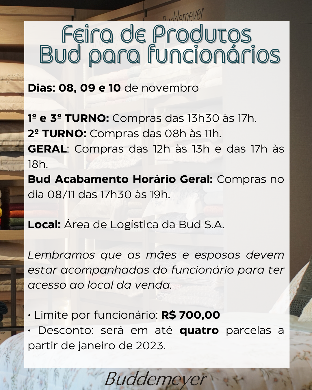 Recursos Humanos • nov 04 • 10:04 Feira de Produtos Buddemeyer Que tal garantir os presentes de natal? Na próxima semana teremos feira de produtos para funcionários. Clique no link e verifique a programação para fazer suas compras.