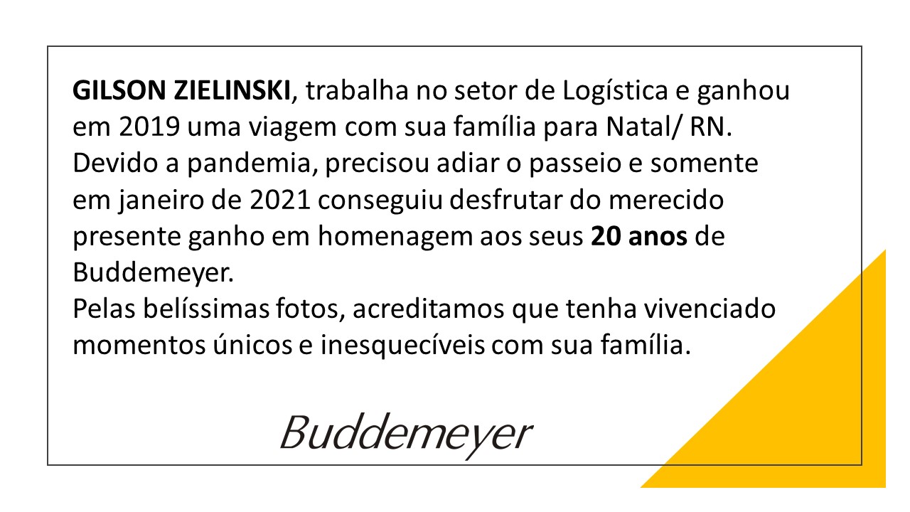 Recursos Humanos • jan 28 • 14:53 Gilson Zielinski desfrutando do presente ganho em homenagem aos 20 anos de dedicação a empresa Clique aqui e sinta a vibração do passeio realizado por Gilson Zielinski e família a Natal/ RN.