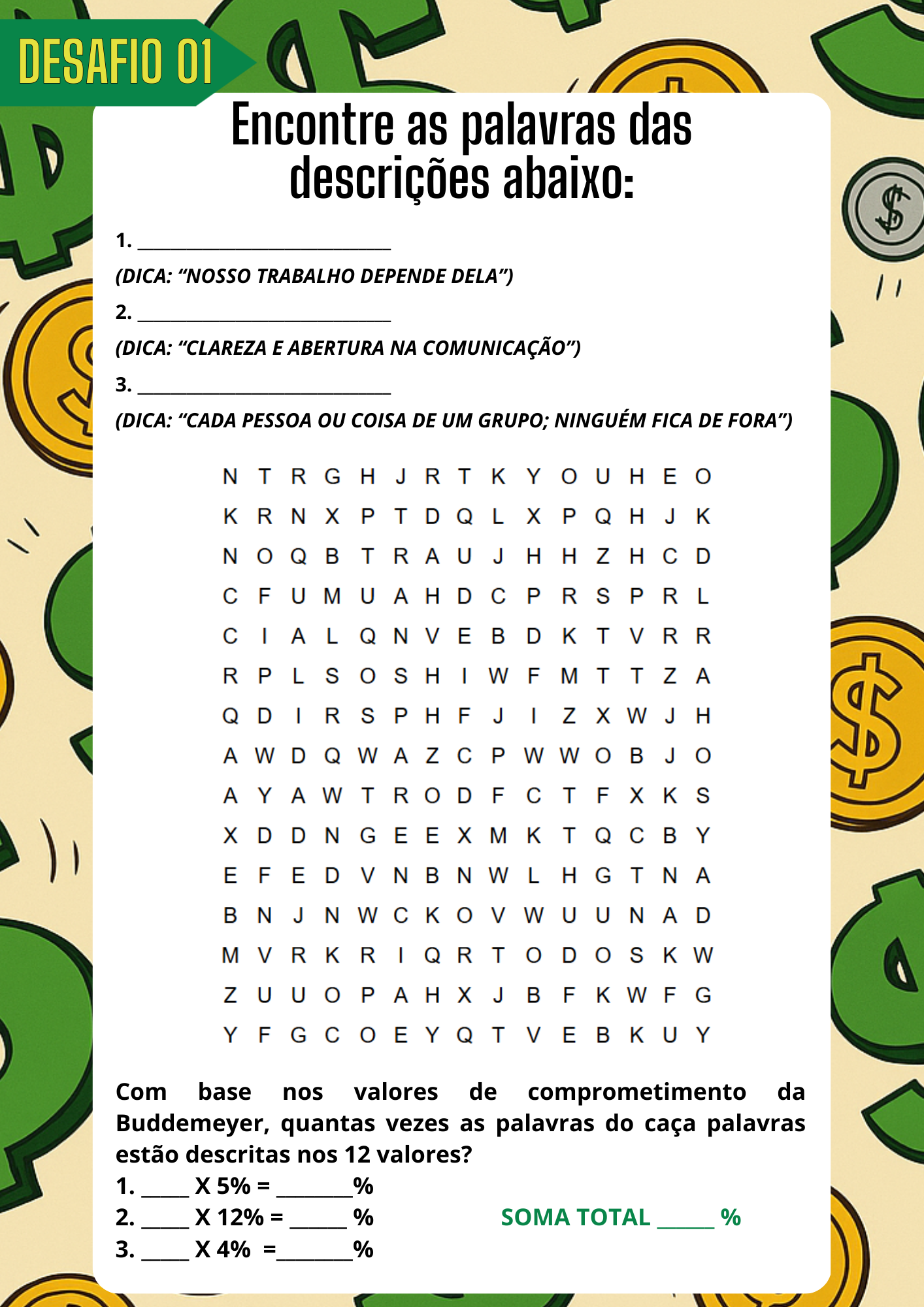 Recursos Humanos • set 15 • 07:31 Hora do Desafio 01 E aí, preparado? Está no ar o primeiro desafio! Sua atenção e raciocínio serão colocados à prova. Quem conseguir desvendar terá acesso a uma parte importante dessa jornada... será que você consegue? 👀