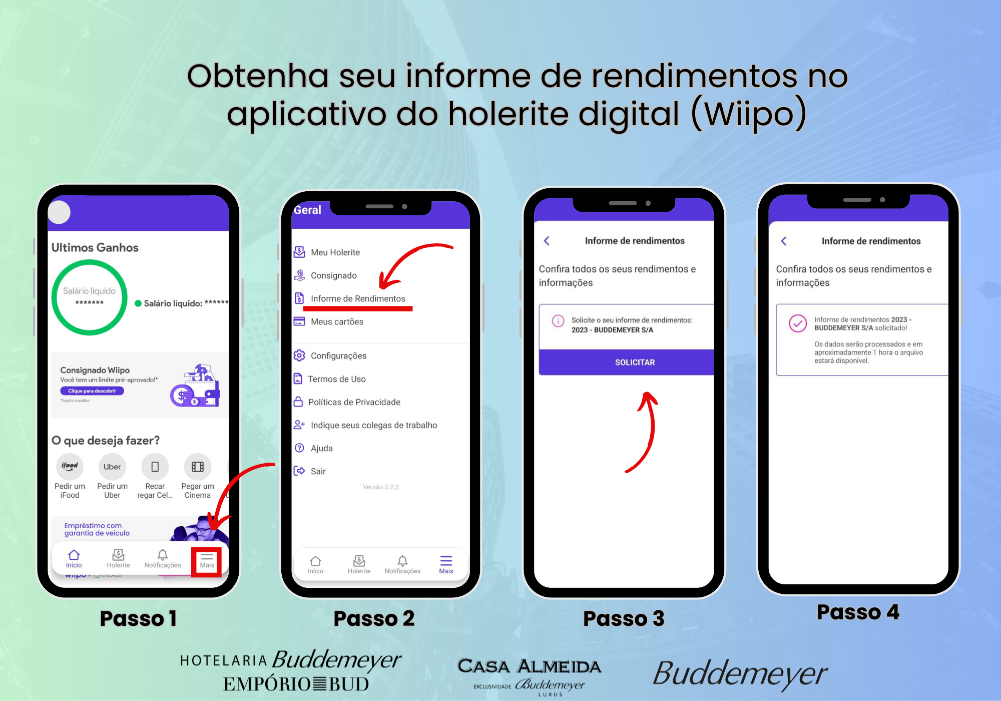 É tempo de organizar sua Declaração de Imposto de Renda! Entre no aplicativo de holerite digital (Wiipo), gere o seu Informe de Rendimentos de forma prática e rápida e já deixe tudo em dia. Se precisar de apoio, o RH está à disposição para orientar você. Antecipe-se e evite imprevistos no prazo final!