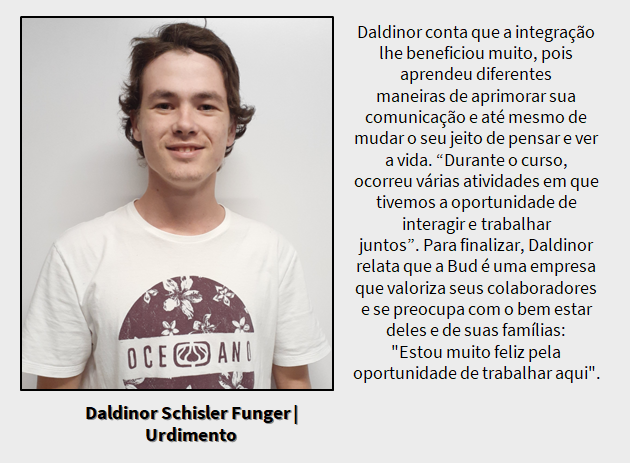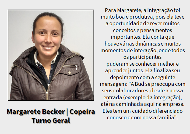 Com o objetivo de oportunizar uma melhor adaptação à cultura da empresa, entre os dias 31 de julho e 02 de agosto, a Bud proporcionou a integração para 28 novos colaboradores. Nesta edição, a colaboradora Margarete Becker, da Copa, e o colaborador Daldinor Schisler Funger, do Urdimento, deixaram seus depoimentos sobre esses dias de aprendizado. Clique aqui e confira os depoimentos, bem como algumas fotos!