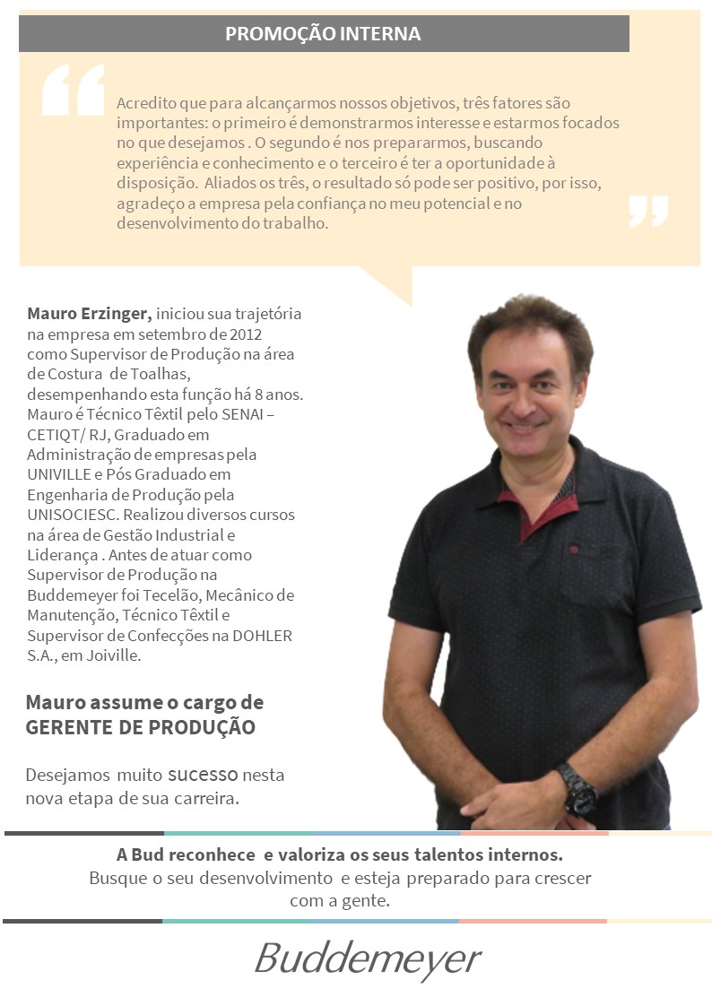 Recursos Humanos • abr 05 • 10:37 Interesse, conhecimento, habilidade e atitude são fatores essenciais para chegar onde se deseja Mais um colega promovido! Clique aqui e conheça a trajetória de Mauro Erzinger - Gerente de Produção.