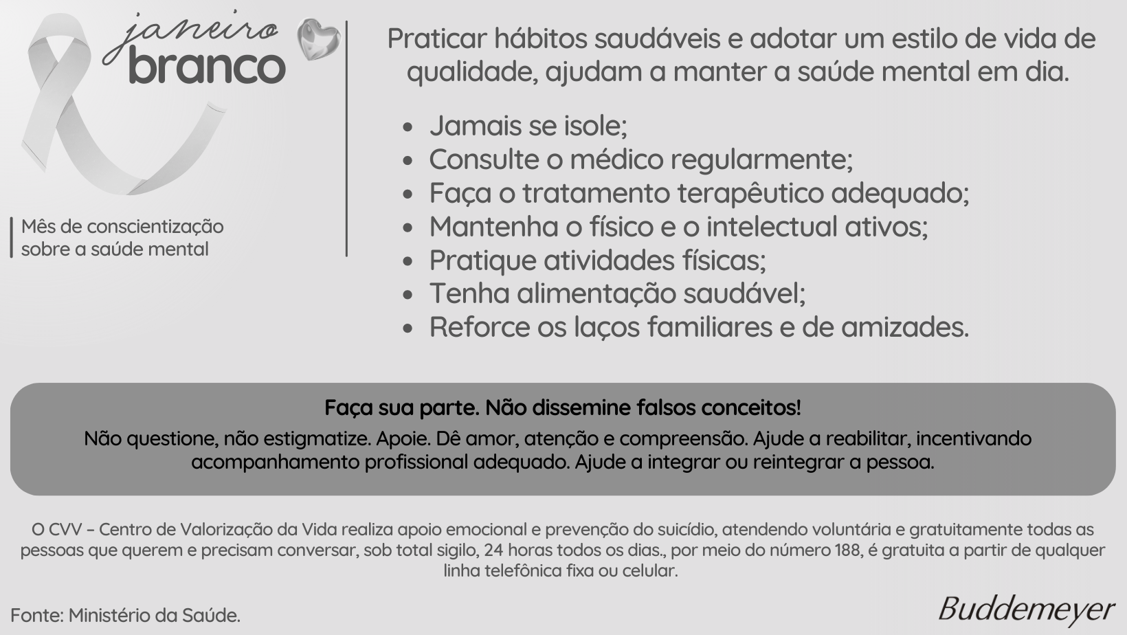 Recursos Humanos • jan 11 • 16:09 Janeiro Branco – Atenção a Saúde Mental. Janeiro é o mês da conscientização sobre a saúde mental, por isso preparamos um post com algumas dicas sobre o tema. Clique no Link e confira.