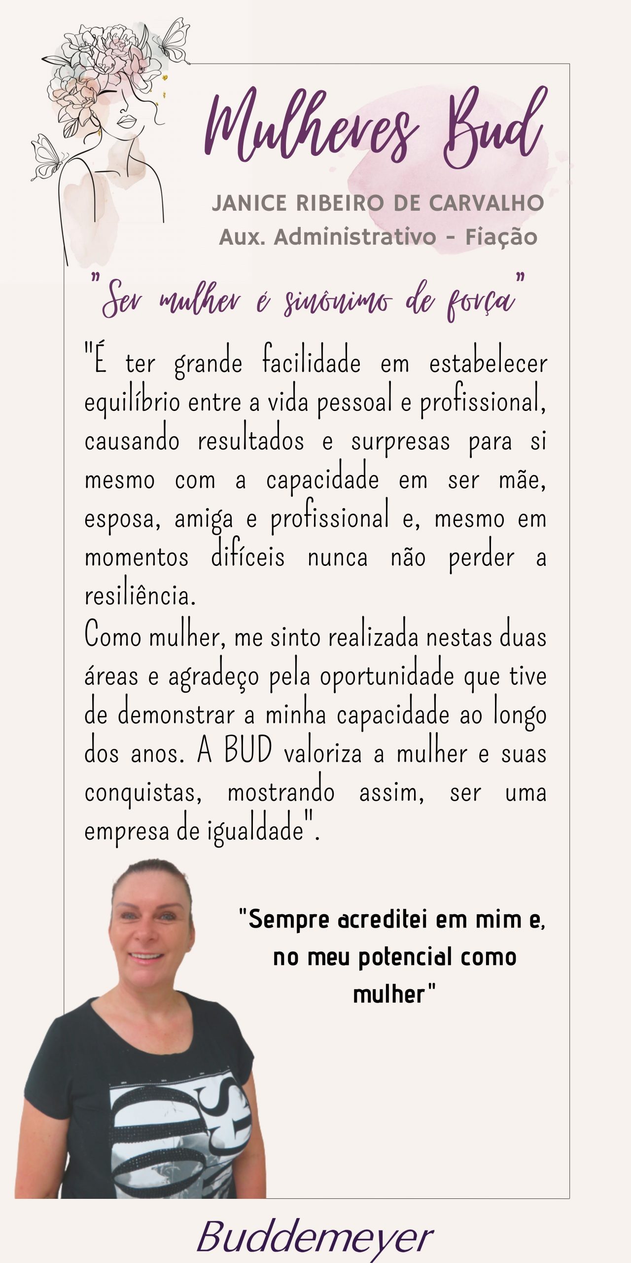 Recursos Humanos • mar 08 • 09:53 Janice, Fiação – MULHERES BUD Hoje vamos conferir o primeiro depoimento do mês das mulheres. Com o tema "Mulheres Bud", Janice nos relatou um pouco suas percepções dos desafios da mulher no trabalho e na vida pessoal. Clique no link e confira!