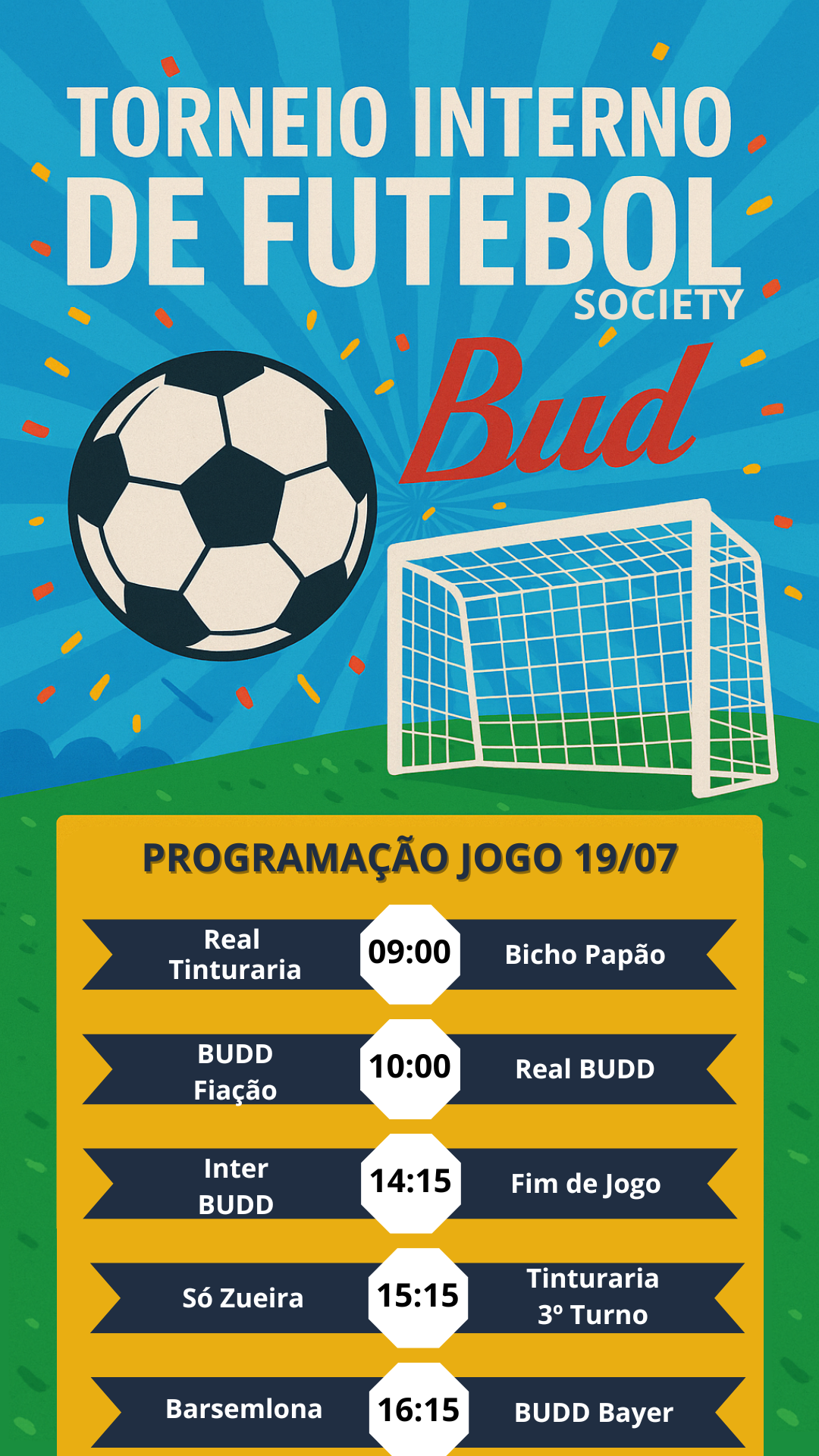 Recursos Humanos • jul 08 • 09:33 Jogos 19/07 – Torneio Interno de Futebol BUD Vai começar o Torneio Interno! No dia 19/07, no GERB, acompanhe os primeiros jogos, apoie os times e entre no clima dessa estreia.