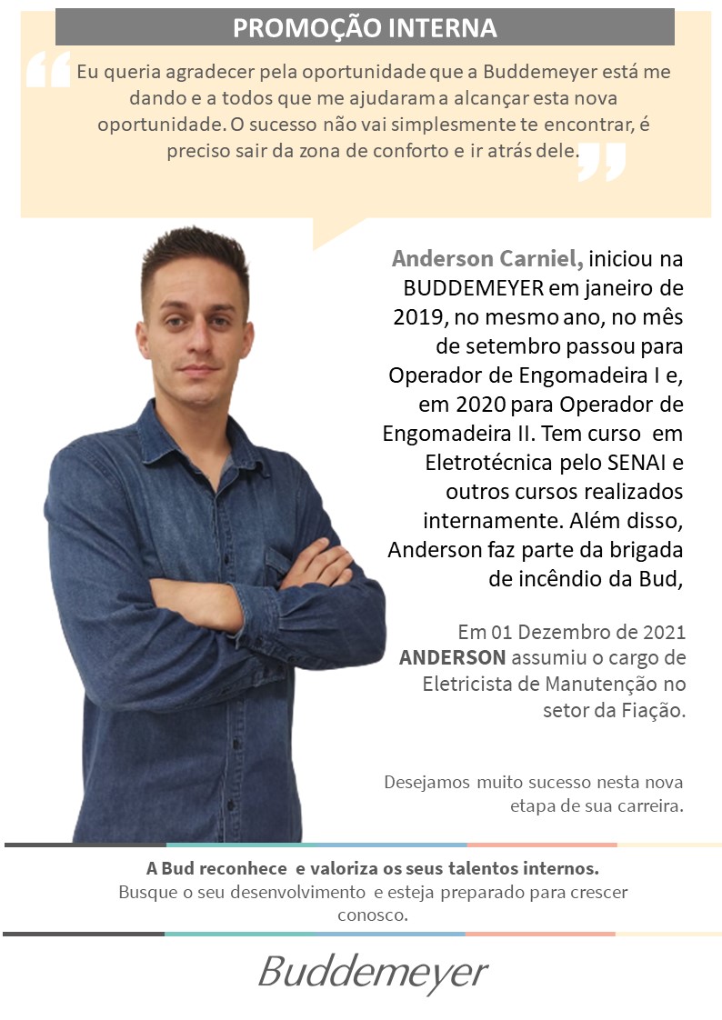 Recursos Humanos • fev 15 • 14:05 O sucesso vem da vontade de conquistarmos nossos sonhos. Clique no link e confira a trajetória de Anderson na BUD.
