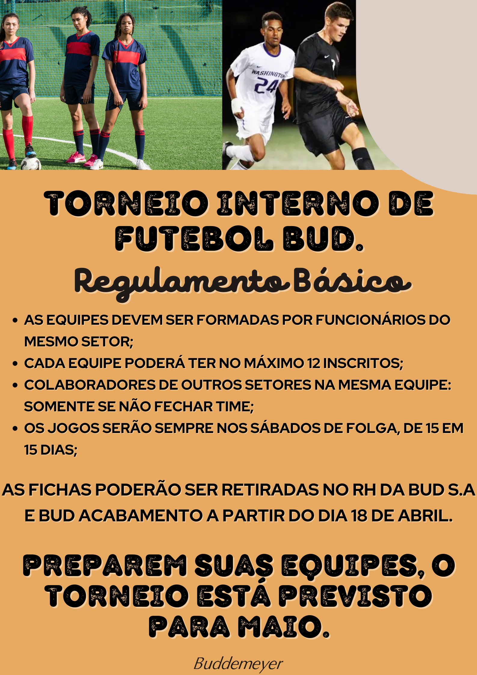 Recursos Humanos • abr 12 • 11:51 O Torneio Interno de Futebol da Bud está chegando… Já preparou seu time? O Torneio de Futebol da Bud está chegando, clique no link e confira as regras.