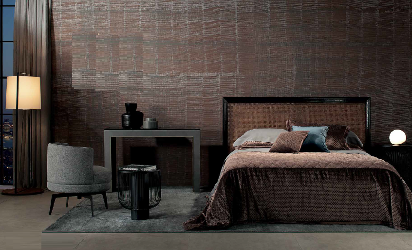 A estampa gravataria minimalista complementa o matelassê em harmonia na linha Oriental. O tom metalizado do veludo dá elegância ao ambiente moderno com interferências orientais.
