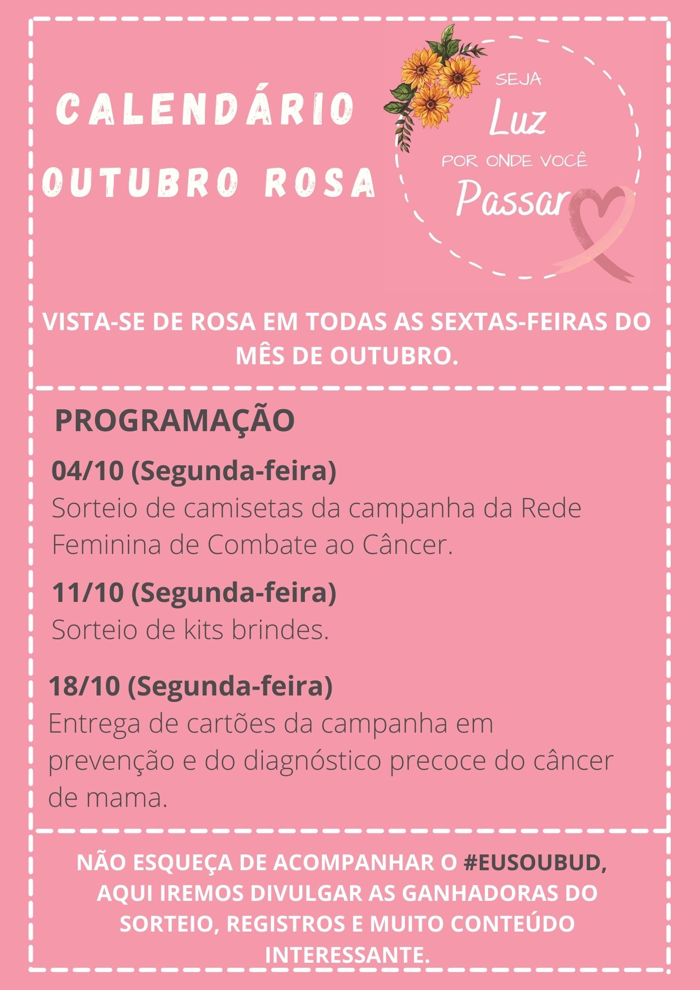 Chegamos a mais um mês de Outubro e mais uma vez nos engajamos na Campanha Mundial de PREVENÇÃO DO CANCÊR DE MAMA. Neste ano a frase do slogan da Campanha é: SEJA LUZ POR ONDE VOCÊ PASSAR, esta se remete ao Girassol e seu significado. Estamos preparando um mês de muitas novidades. Clique no link e confira o cronograma OUTUBRO ROSA 2021 DA BUD.