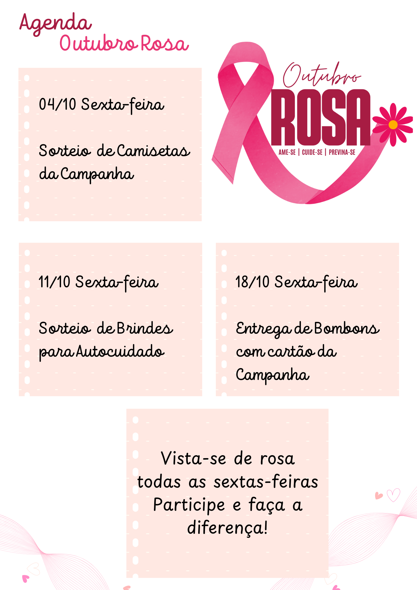 Durante esse mês, aderimos ao Outubro Rosa, uma campanha fundamental para a conscientização sobre o câncer de mama. Contamos com a participação de todos para apoiar essa iniciativa, que salva vidas por meio da prevenção e do diagnóstico precoce. Participe, vista-se de rosa nas sextas-feiras e fique atento às ações especiais que preparamos. Cuidar da saúde é um ato de amor, e juntos podemos fazer a diferença!