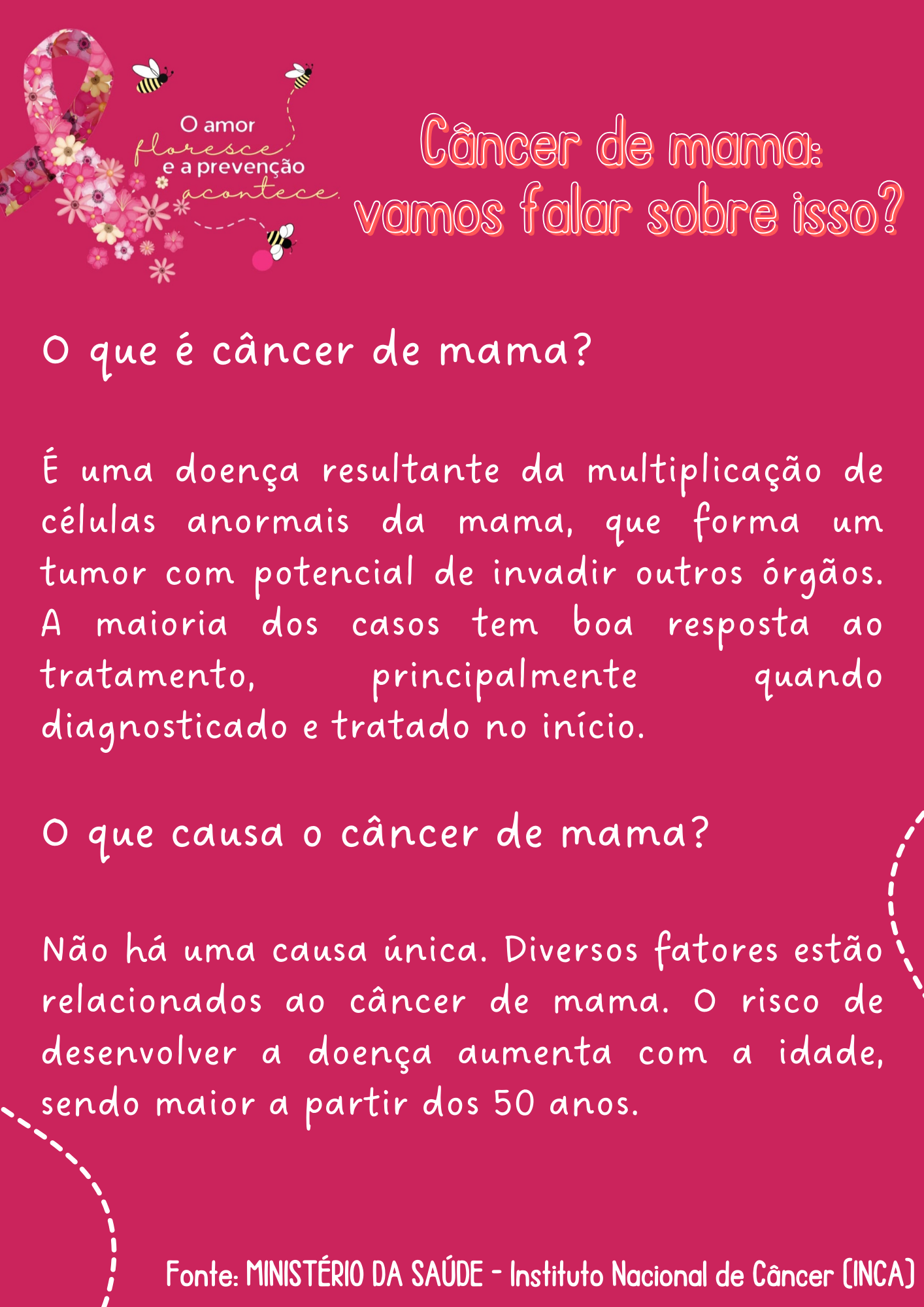 Recursos Humanos • out 06 • 16:03 Outubro Rosa: Câncer de Mama Embora seja um tema difícil de tratar, falar abertamente sobre o câncer pode ajudar a esclarecer mitos e verdades e, com isso, aumentar o conhecimento e diminuir o temor associado à doença.