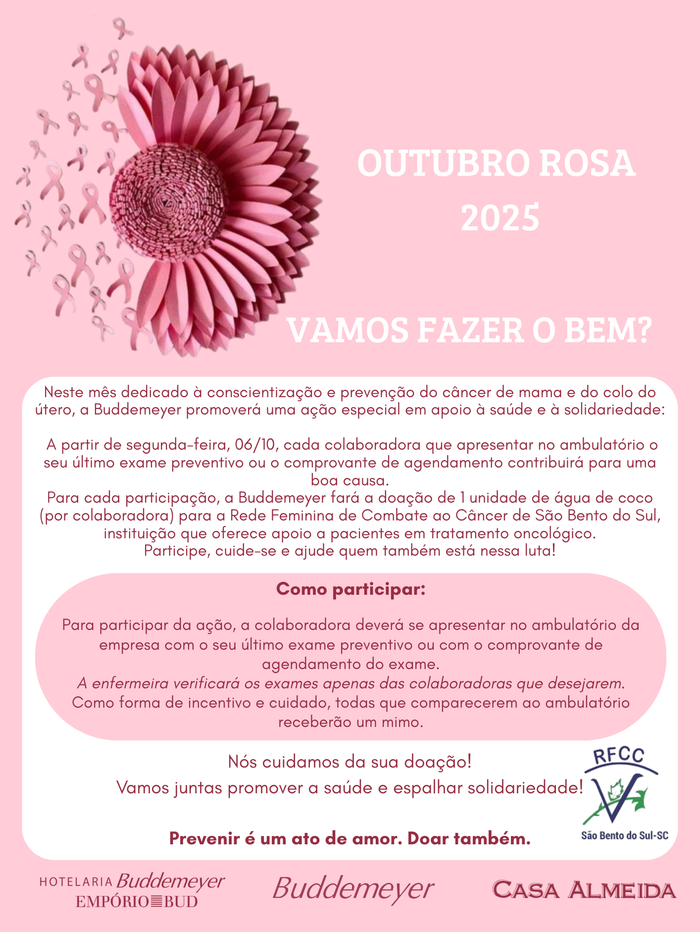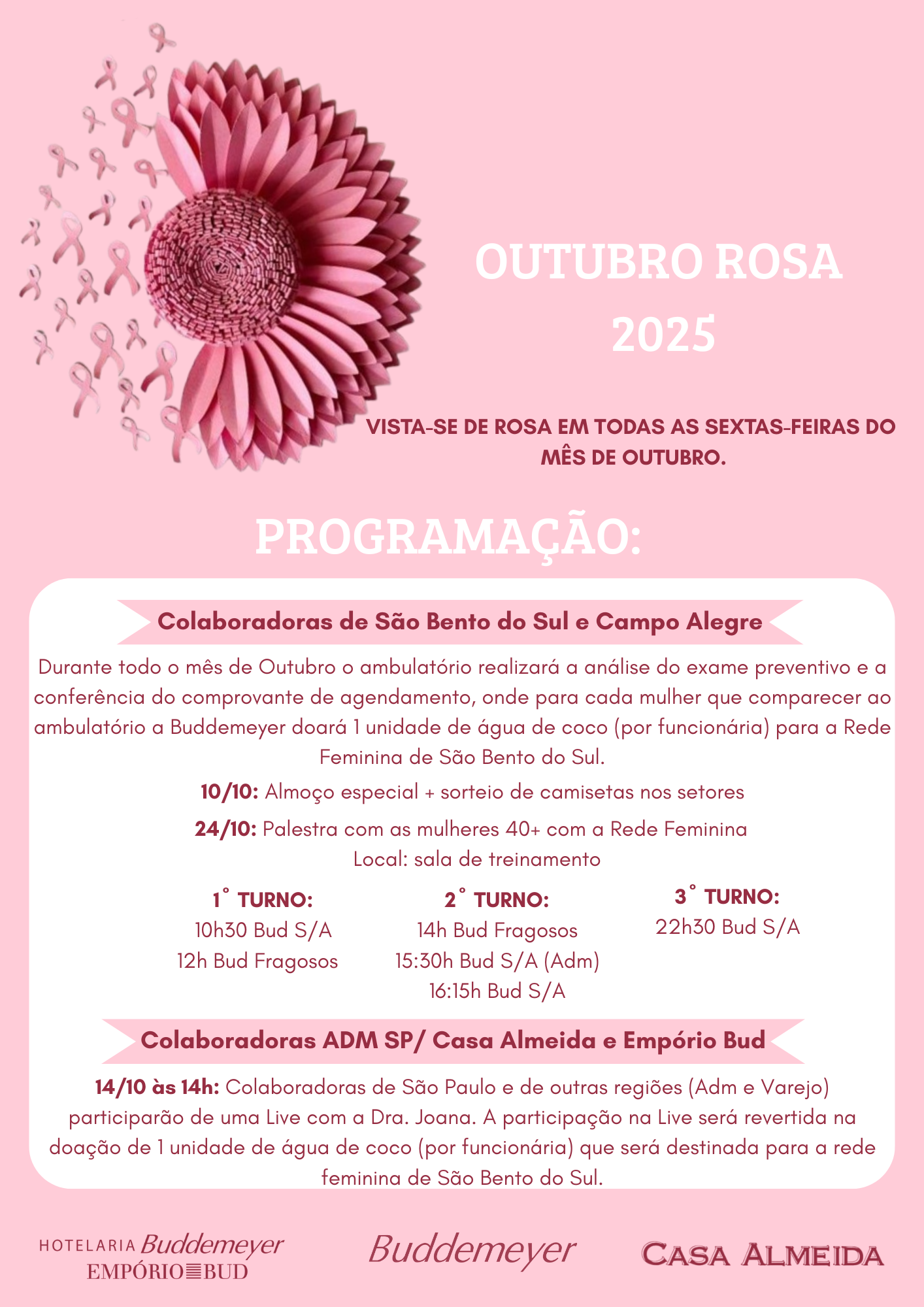 Recursos Humanos • out 07 • 16:25 Outubro Rosa 2025 Outubro Rosa começou! 🌸 Iniciamos o mês de outubro e, com ele, damos início à campanha Outubro Rosa, um movimento de conscientização sobre a importância da prevenção e do diagnóstico precoce do câncer de mama.