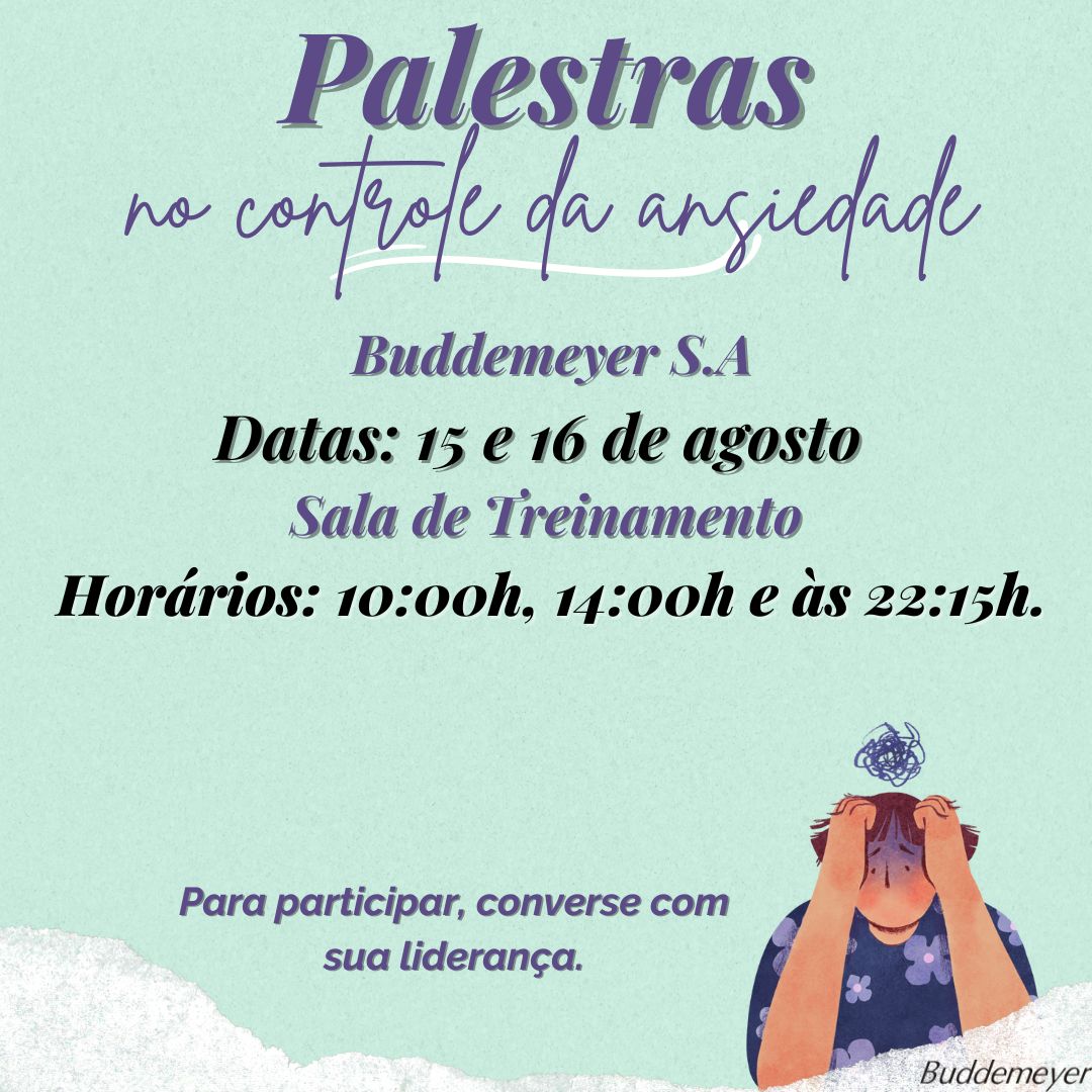 Devido a inúmeros pedidos feitos a partir dos grupos de GMC’s e lideranças no geral, a Bud vai oferecer novamente a palestra que foi realizada na SIPAT/2023 sobre o controle da ansiedade com a Psicóloga Elisane Cordeiro. Serão 12 palestras, sendo 6 na Bud S.A e 6 na Bud Acabamento. Confira as datas das palestras da BUD S.A, em breve divulgaremos as datas de Fragosos.