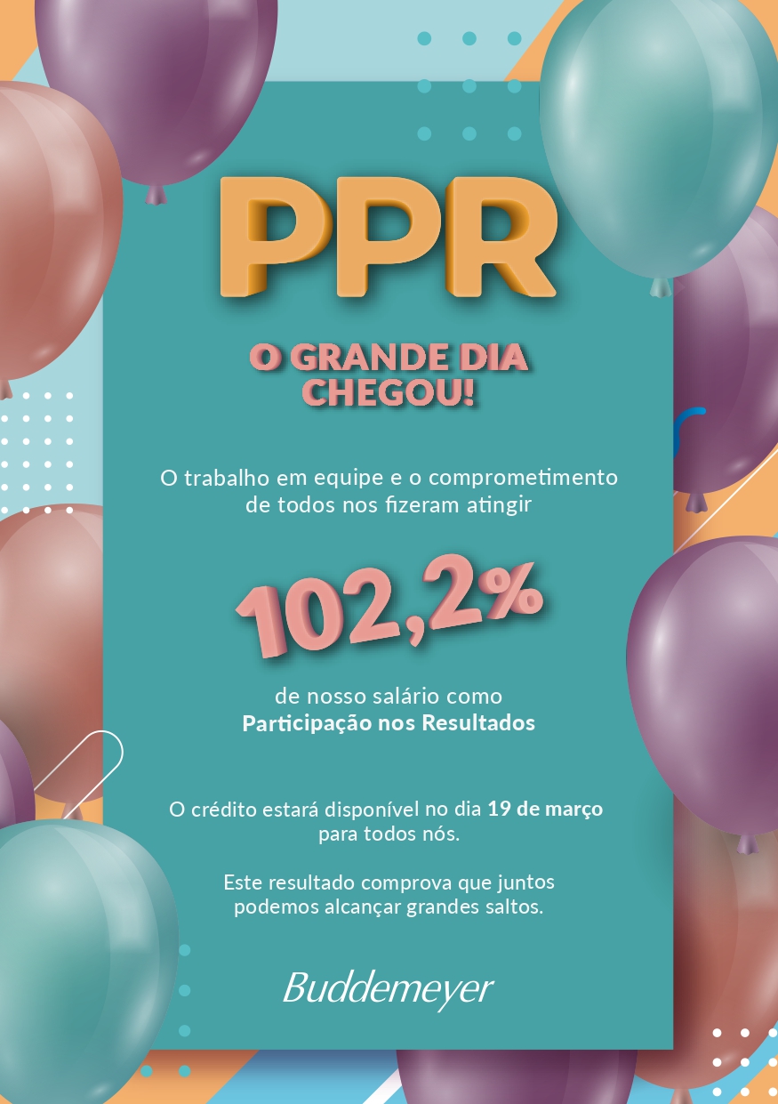 Na Buddemeyer, acreditamos que o sucesso é construído por cada um de nós, juntos. O pagamento do Prêmio de Participação de Resultados (PPR), com um índice expressivo de 102,2%, não é apenas um número, mas um reflexo do comprometimento, do esforço e da dedicação de todos.