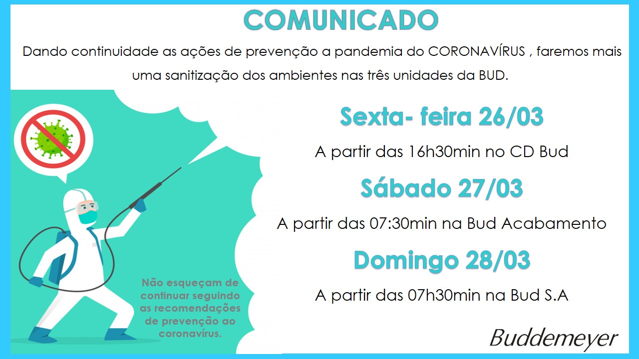 Recursos Humanos • mar 25 • 10:42 Prevenção é a solução! Dando continuidade as ações de prevenção a pandemia do CORONAVÍRUS , faremos mais uma sanitização dos ambientes nas três unidades da BUD.