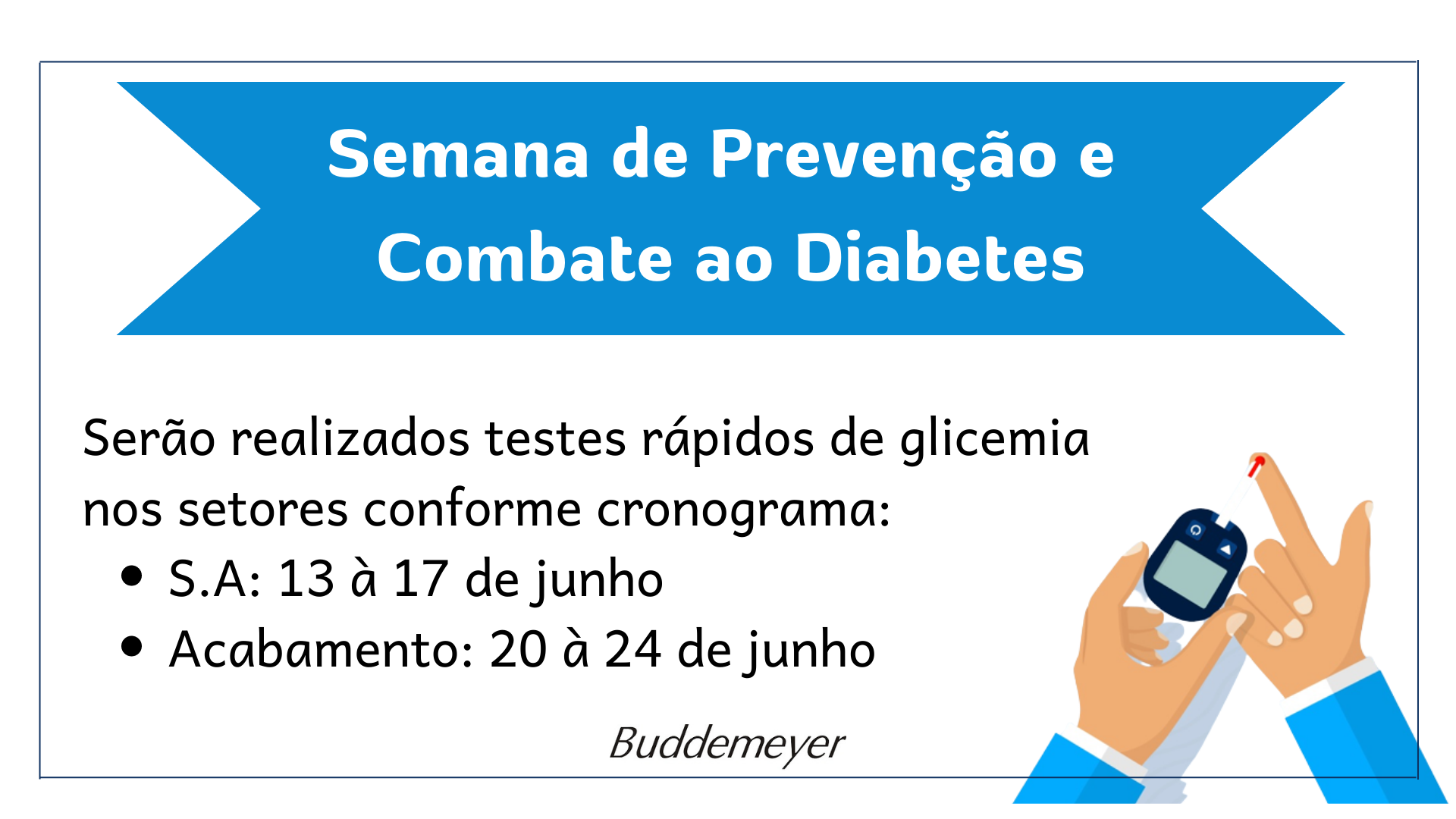 Recursos Humanos • jun 09 • 14:20 Prevenção e Combate ao Diabetes A Semana de Prevenção e Combate ao Diabetes inicia na próxima segunda-feira (13/06) na Bud. Clique no link e confira o cronograma da Campanha e também algumas informações sobre a doença.