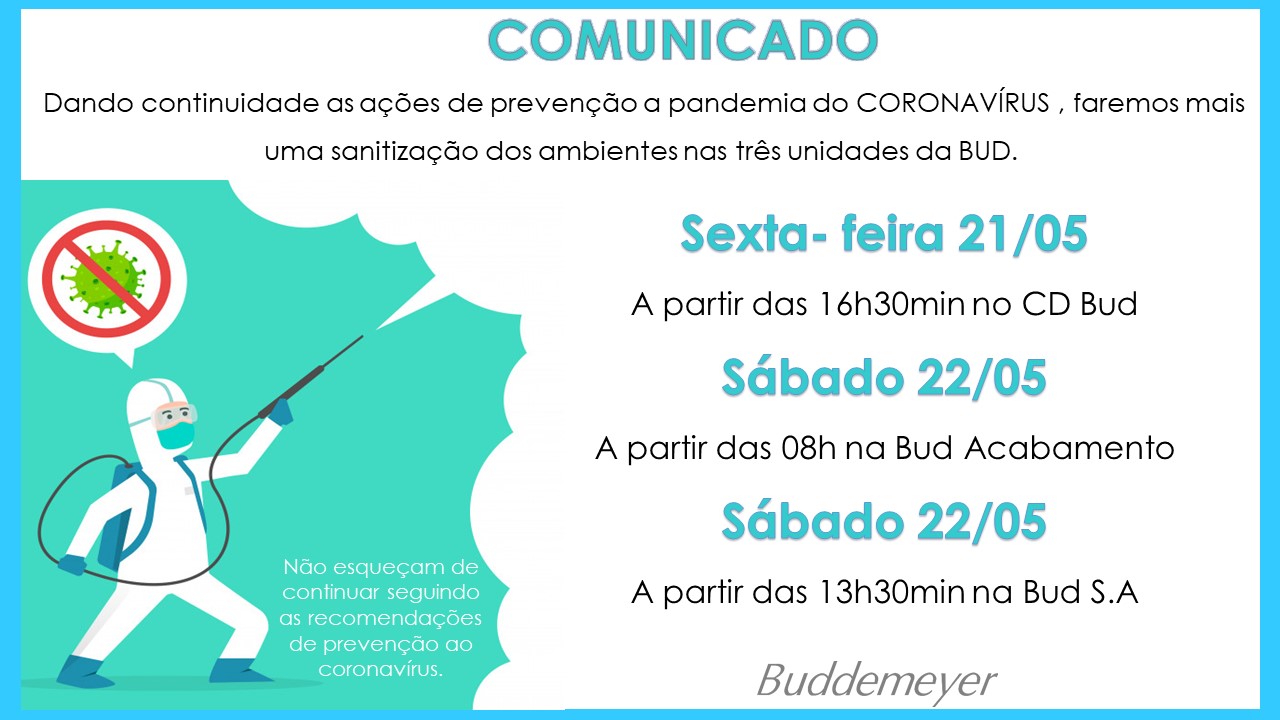 Recursos Humanos • maio 20 • 17:34 Prevenção sempre é a melhor opção Sempre atentos e vigilantes! Esta semana faremos mais uma sanitização, clique aqui e confira as datas e horários.