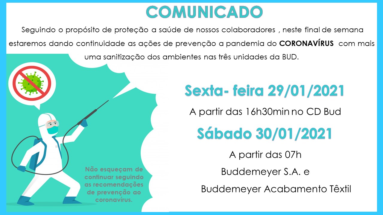 Recursos Humanos • jan 29 • 15:59 PREVENIR PARA PROTEGER A prevenção sempre é a melhor opção. Este final de semana teremos mais uma sanitização na empresa. Clique aqui e fique por dentro do que acontecerá.