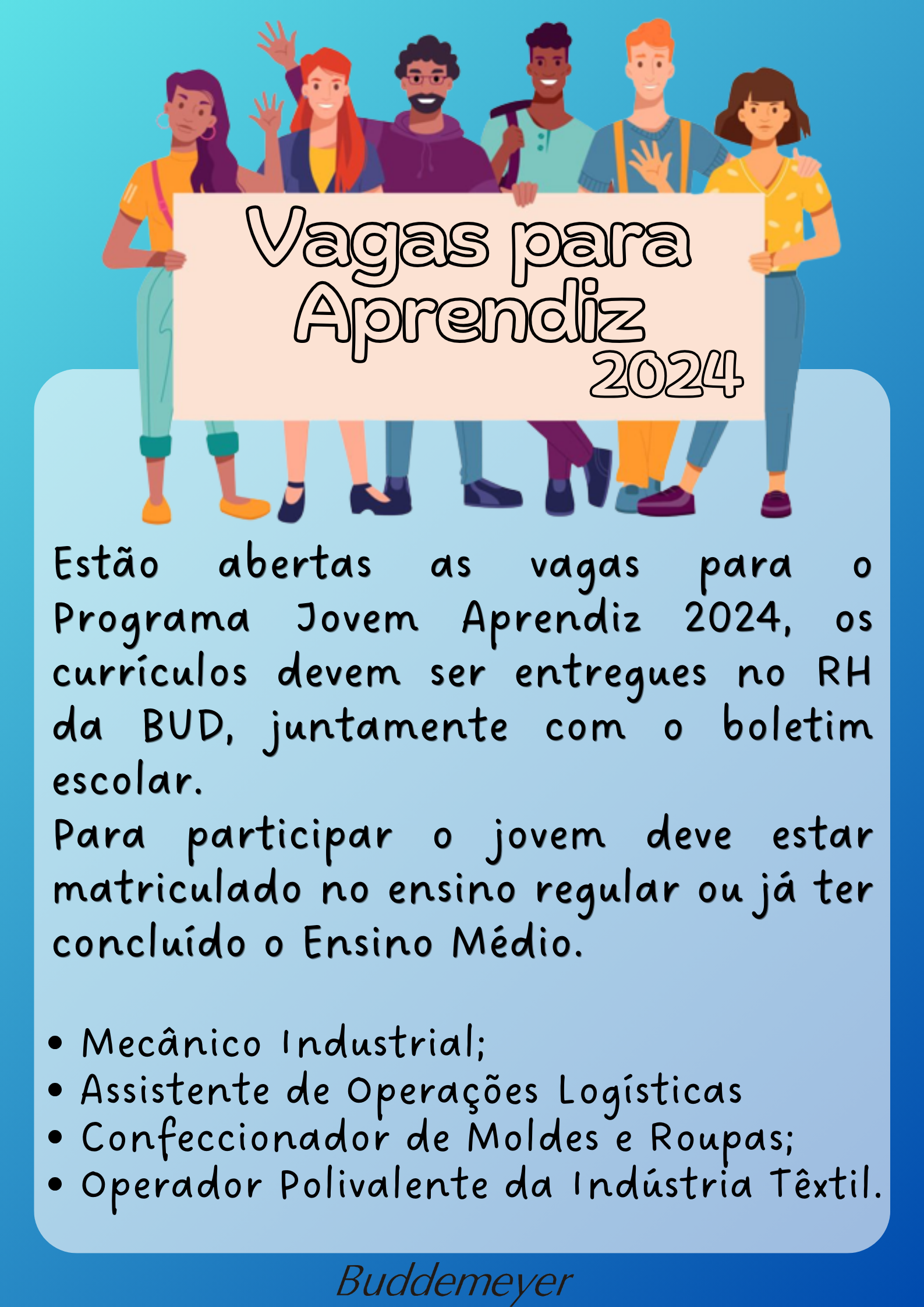 Recursos Humanos • out 30 • 11:51 Programa Jovem Aprendiz 2024 Estão abertas as vagas para o Programa Jovem Aprendiz 2024, clique no link e confira quais são os critérios para entrega de currículo!