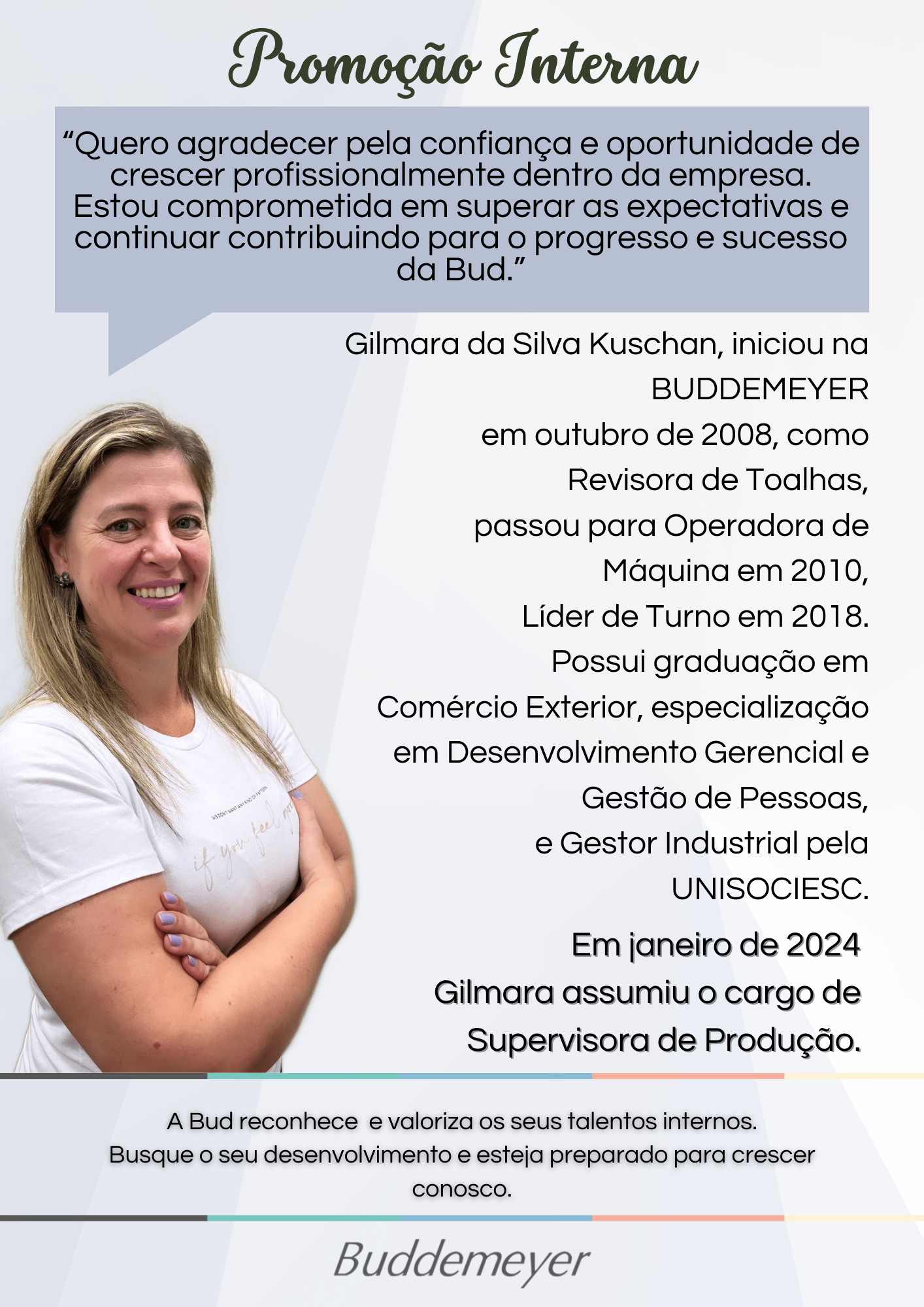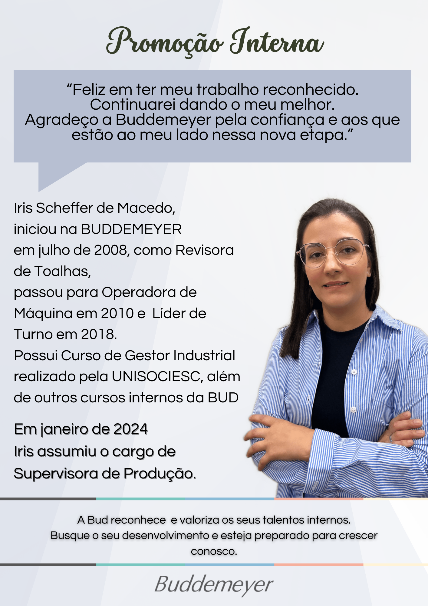 Recursos Humanos • mar 07 • 08:06 Promoção Interna A BUD reconhece e valoriza seus talentos. Vamos conferir a trajetória das colegas Iris e Gilmara do setor Confecção de Toalhas. Clique e confira.