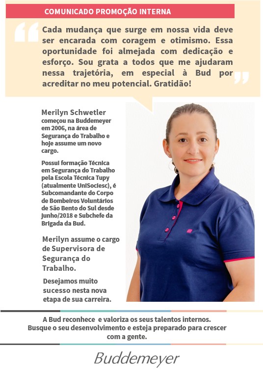 eusoubud • fev 15 • 14:19 Promoção Interna Merilyn Schwetler começou na Buddemeyer em 2006, na área de Segurança do Trabalho e hoje assume um novo cargo.