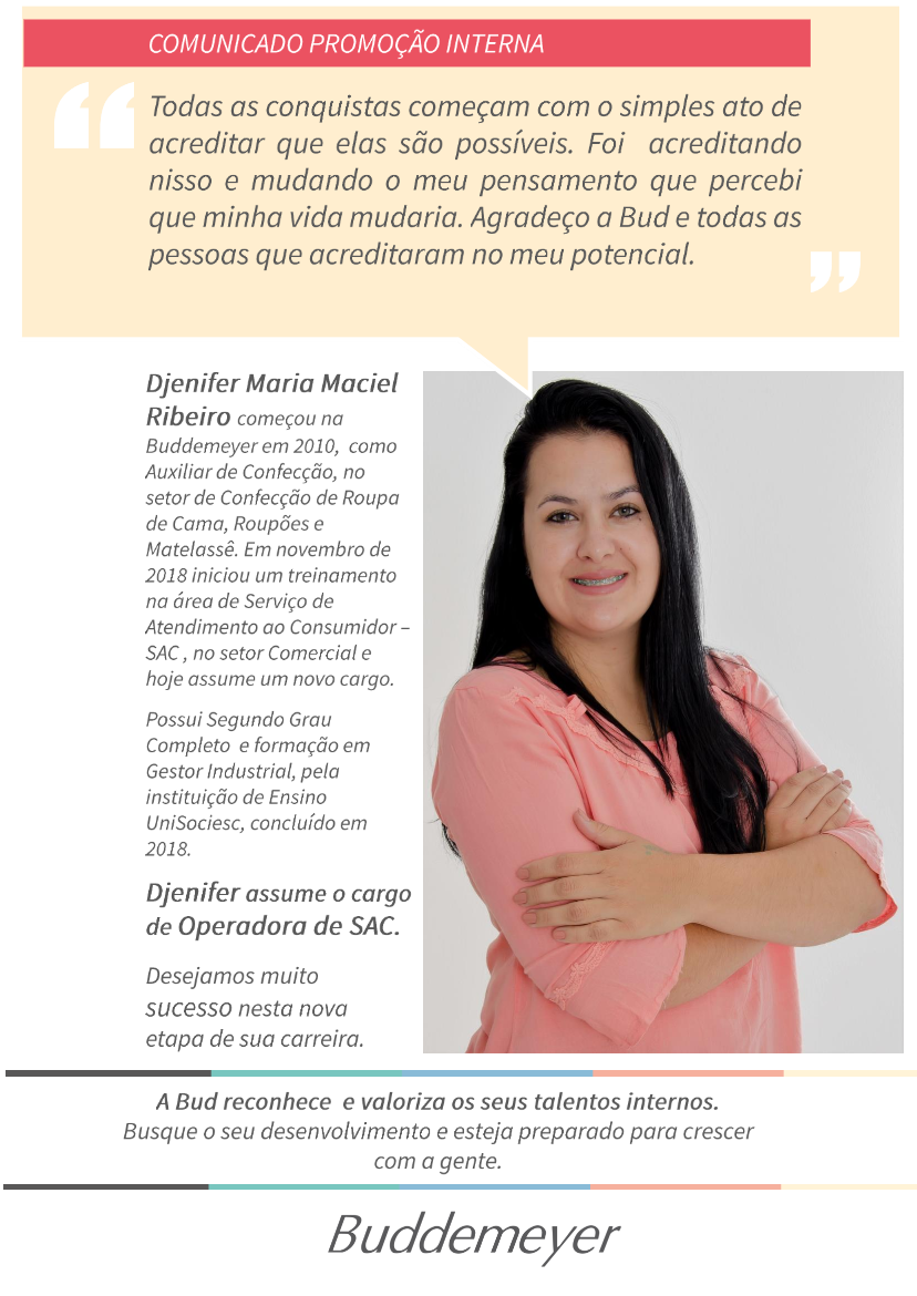 Mais um talento interno sendo reconhecido e valorizado pela Bud. A colaboradora Djenifer Maria Maciel Ribeiro começou na Buddemeyer em 2010, como Auxiliar de Confecção, Abastecedora e Revisora do setor de Confecção de Roupa de Cama | Roupões | Matelassê e hoje assume um novo cargo.
