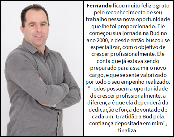 Mais um talento interno sendo valorizado e reconhecido pela Bud. O colaborador Fernando Moreira começou na Buddemeyer em 2000, no setor da Tinturaria e assumiu o cargo de Líder do 3º Turno. Conheça um pouco sobre sua trajetória. Acesse.