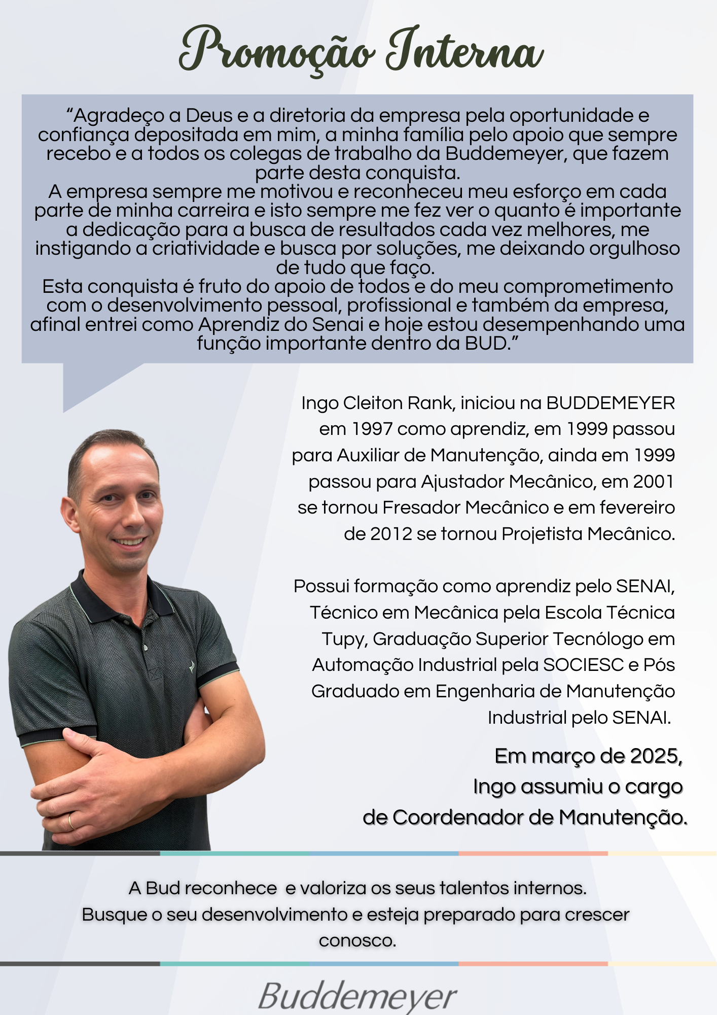Recursos Humanos • abr 23 • 07:36 Promoção Interna – Ingo Cleiton Rank Conheça a trajetória de sucesso do colaborador Ingo na Buddemeyer.