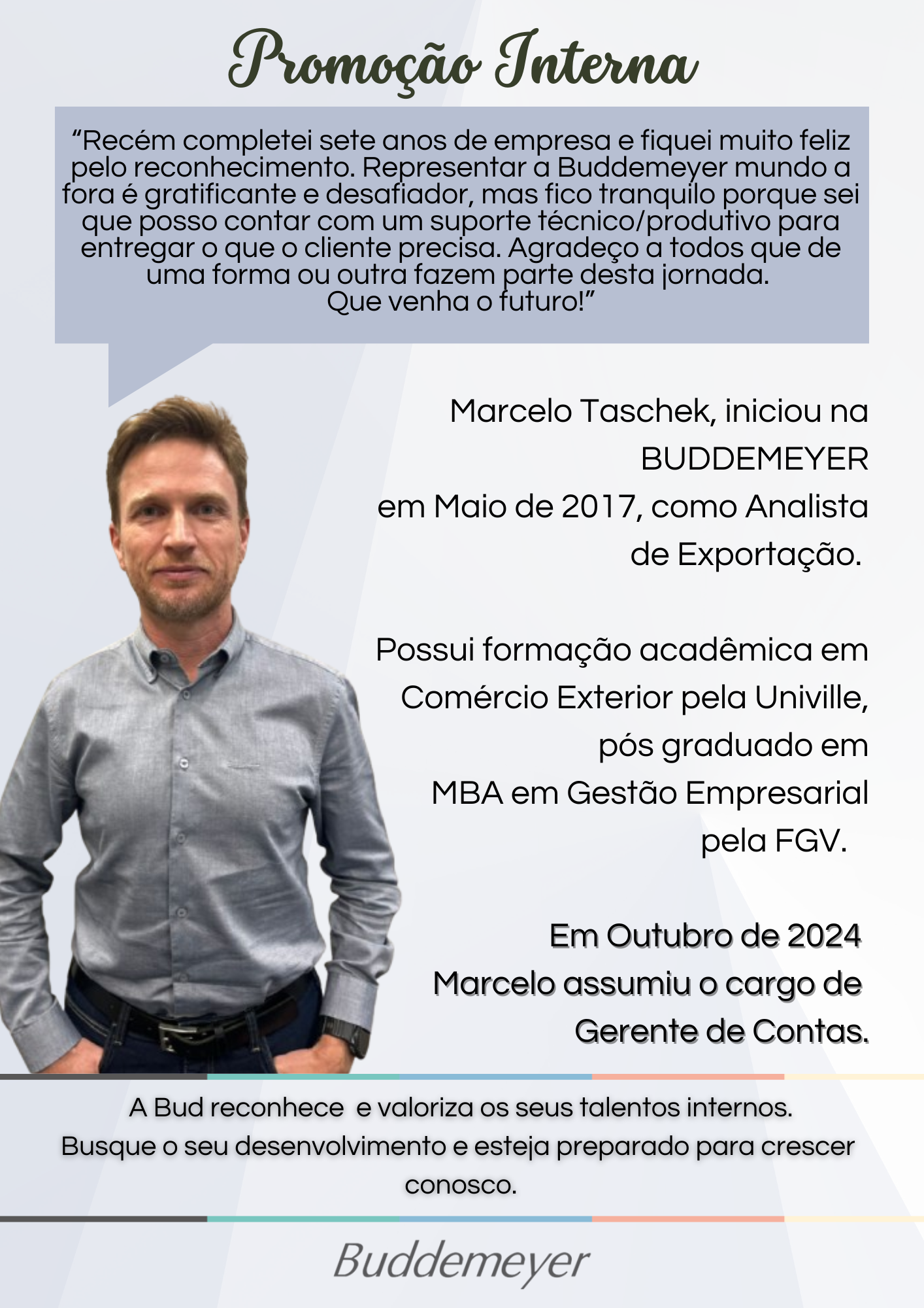 Recursos Humanos • out 10 • 14:37 Promoção Interna – Marcelo Taschek Vamos conferir a trajetória de sucesso do nosso colega Marcelo.