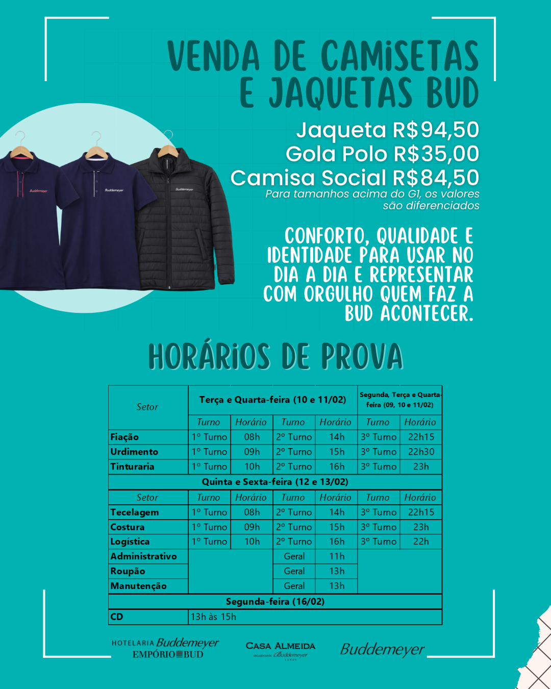 Recursos Humanos • fev 06 • 14:50 Quem é BUD, veste BUD Já estão disponíveis as camisetas e jaquetas BUD!As peças poderão ser provadas conforme o horário disponível, no Espaço Cultural (S.A.) e na Sala de Treinamento (Fragosos).